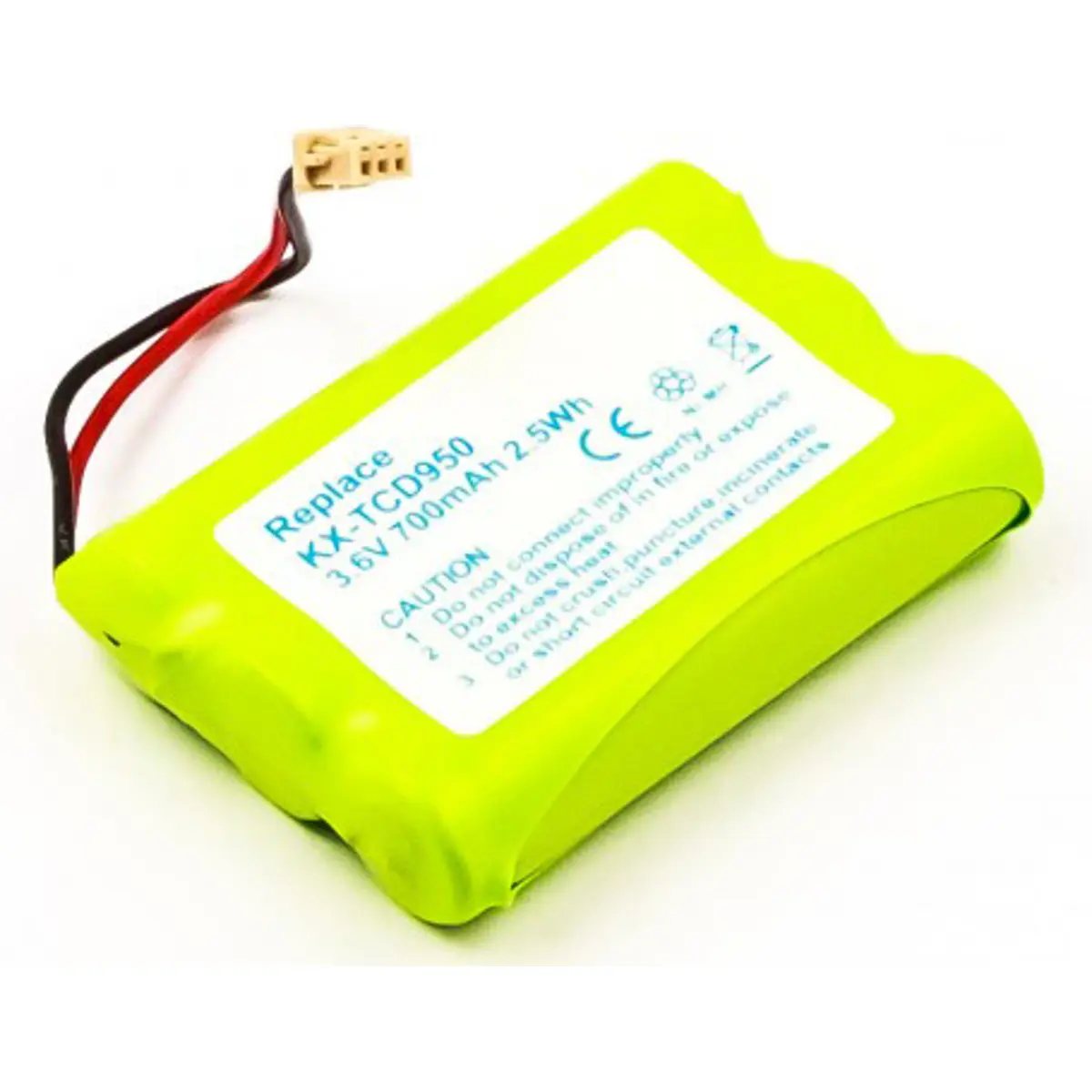 Esta bateria recarregável para telefone sem fios é compatível com Panasonic KX-TCD950, KX-TCD960 e KX-TCD970. Com 3,6V, 700mAh e 2,5Wh em NiMH, fornece energia estável para chamadas. Dimensões de 32,4 x 44,5 x 10,5 mm e peso de 35 g asseguram encaixe adequado para uso diário.