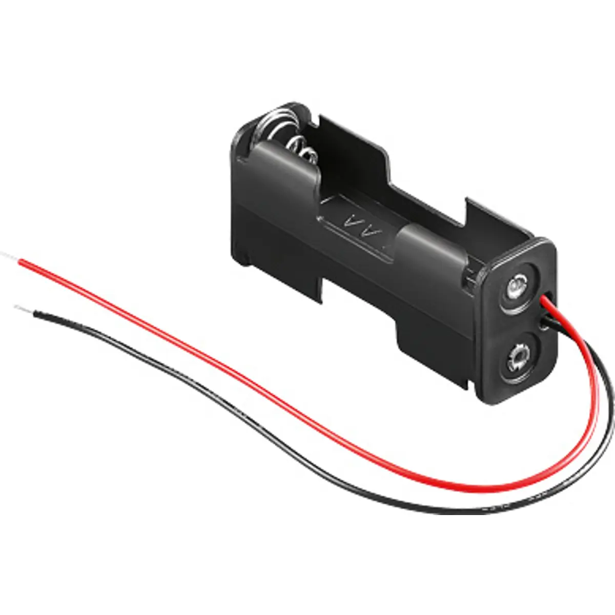 Suporte de pilhas para duas pilhas AA em série com saída de fios. Alojamento em caixa preta com cabo de 150 mm e ligação R6, ideal para alimentar dispositivos eletrónicos e protótipos de eletrónica. Este acessório facilita a alimentação de circuitos com baterias, fornecendo uma solução compacta e simples de instalar com terminais de fios.