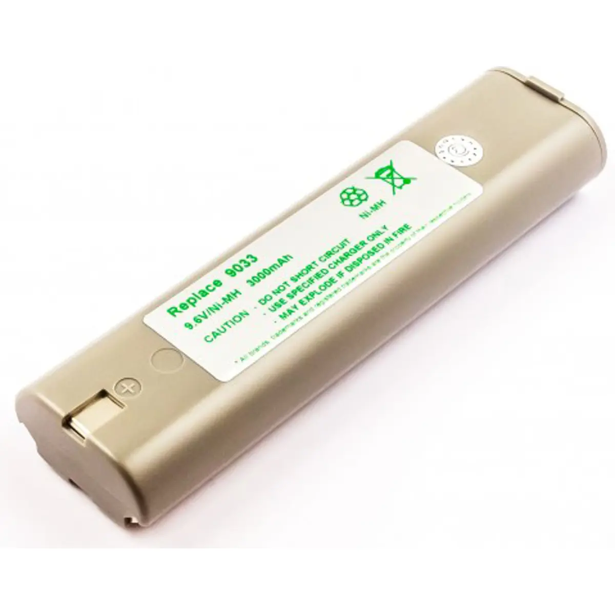Bateria NiMH de 9.6V para ferramentas compatíveis com Makita 9033, com capacidade de 3000mAh e energia de 28.8Wh. Oferece autonomia estável para trabalhos prolongados, com dimensões de 181.2 x 48.6 x 30.7 mm e peso de 521 g. Construída em NiMH, proporciona desempenho fiável, recarregável e compatibilidade com baterias do mesmo sistema, assegurando substituição segura e eficiente.