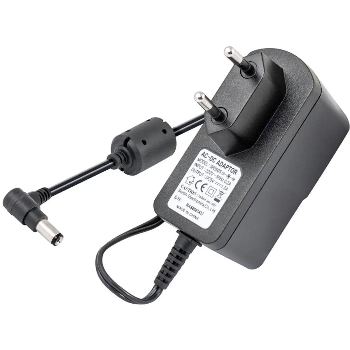 Converte 230V AC em 5V DC com 7,5W de potência e 1,5A de corrente de saída. O conector DC é de 5,5x2,1x9,0 mm. Sem referência a marca, destina-se à alimentação de dispositivos que requerem baixa tensão a partir da rede eléctrica.