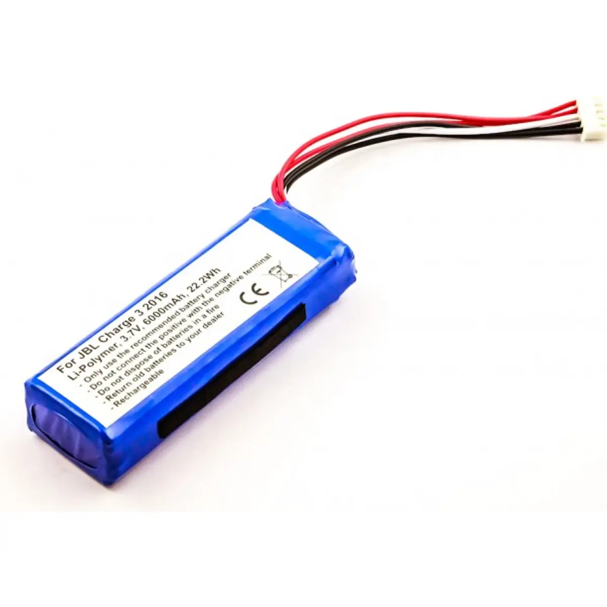 Bateria de substituição com tecnologia Li-Polímero de 3,7V e 6000mAh (22,2W), com ficha de 13x8mm. Disponível em duas versões, referências 035-0771 e 035-0651, compatível com JBL Charge 3 2016. Ideal para reposição de energia de dispositivos portáteis, mantendo a tensão e a capacidade originais.