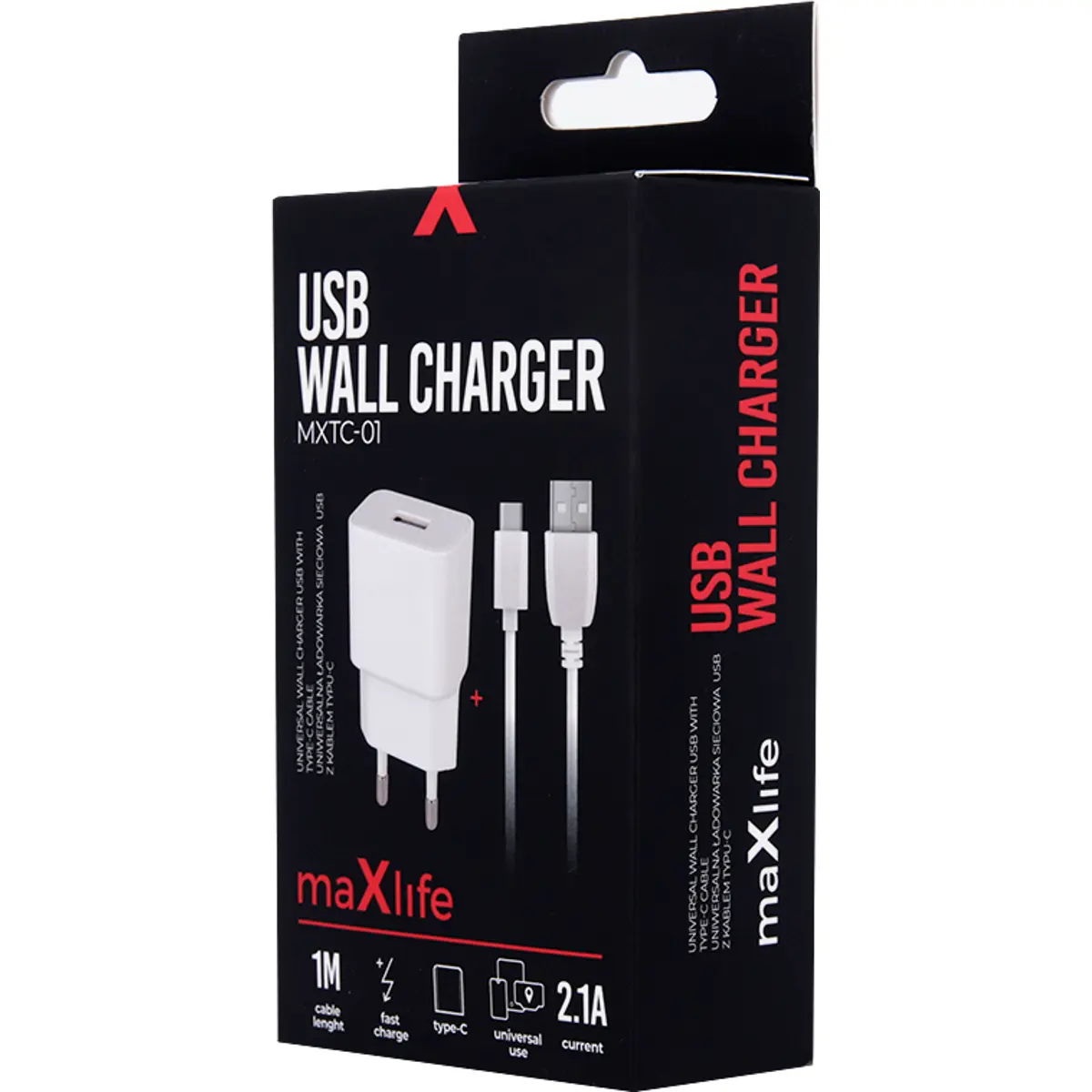 Maxlife MXTC-01 - Carregador 1xUSB (230VAC -> 5VDC) 2.1A c/ cabo USB-C 1.0m - branco
