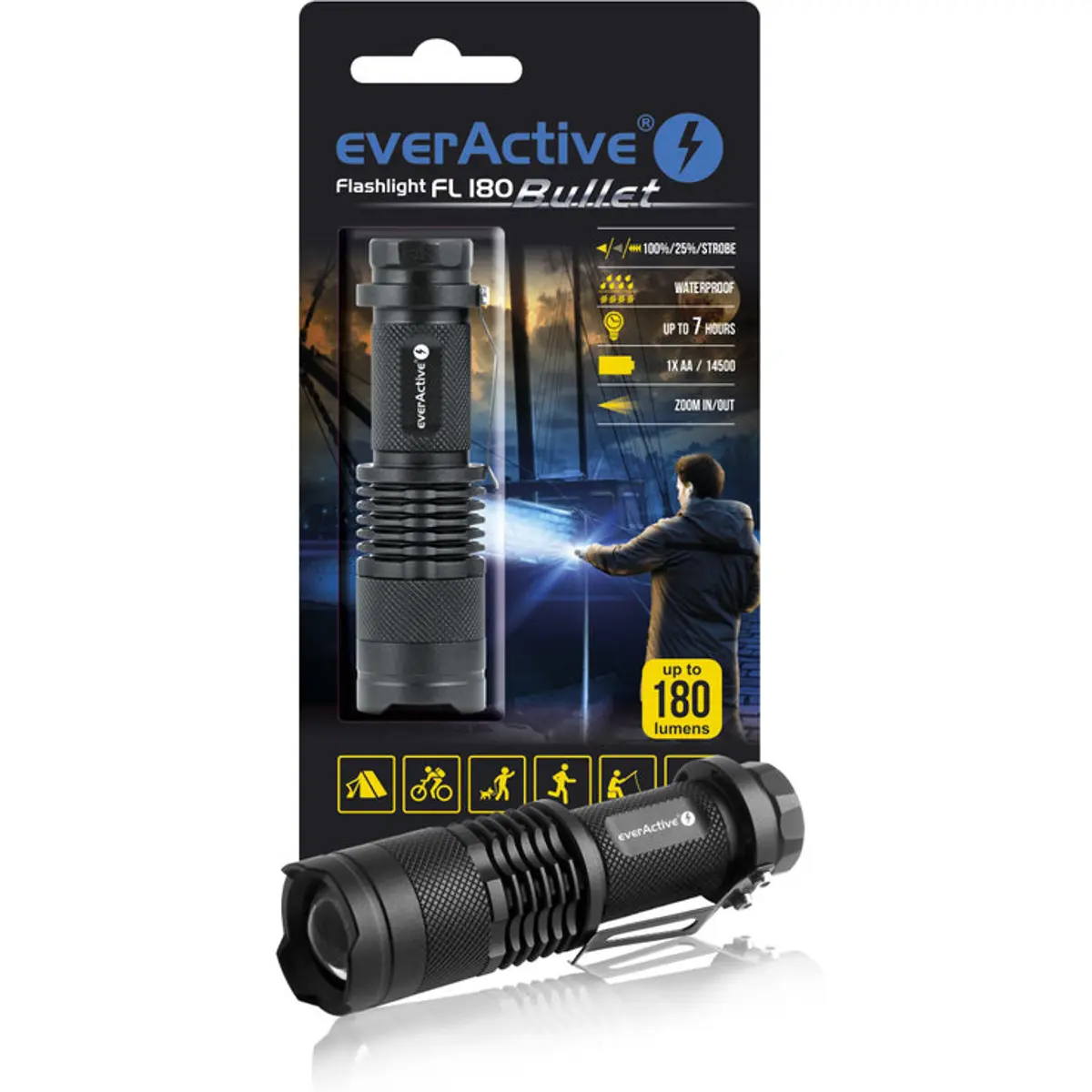 FL-180 é uma lanterna extremamente pequena, porém poderosa, da marca everActive . A potência da luz de aproximadamente 200 lúmens e a possibilidade de alimentação com qualquer pilha R6 / AA (baterias alcalinas de 1,5V ou baterias recarregáveis de Ni-MH de 1,2V e até 3.700 baterias de lítio 3,7V) tornam o FL-180 extremamente versátil e conveniente em usar.