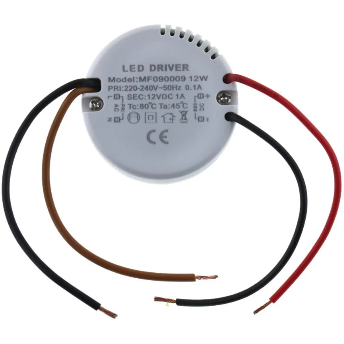 Fonte de alimentação compacta para LED, com entrada universal 100-240V AC e saída estável de 12V DC. Fornece até 1A e 12W, com isolamento galvânico e proteção IP20 para uso em ambientes internos. Construção com diâmetros Ø55x22mm, adequada para caixas de embutir, oferecendo fiabilidade, segurança e instalação simples para iluminação LED.