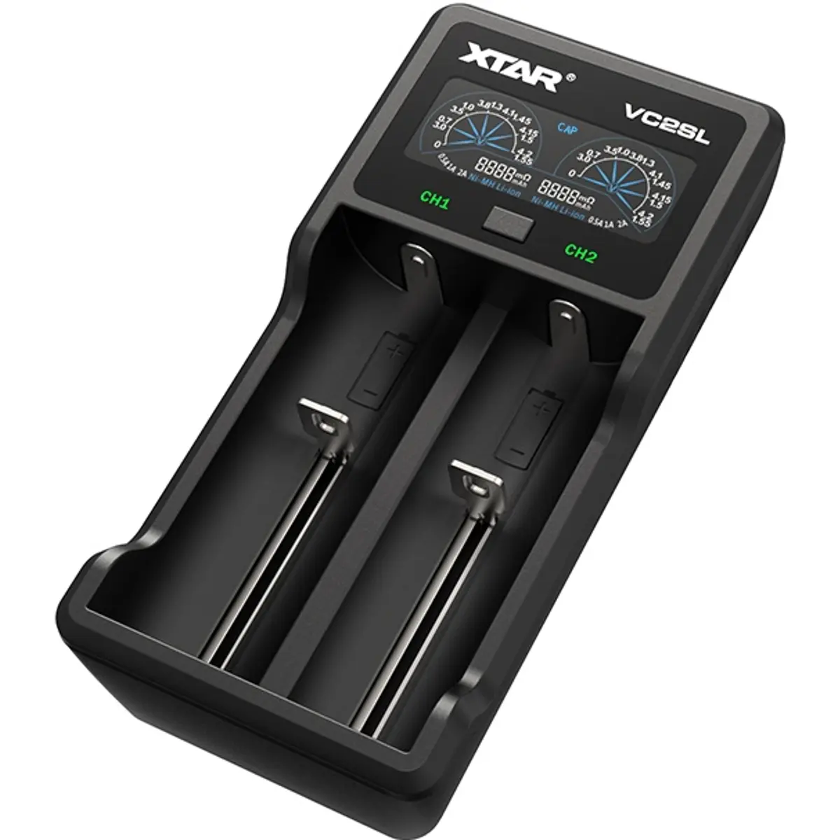 Display VA LCD do carregador iluminado Xtar VC2S mostra informações atualizadas sobre o status operacional do carregador: baterias recarregáveis expressas em mAh, tensão da bateria, corrente de carga e resistência interna da célula.