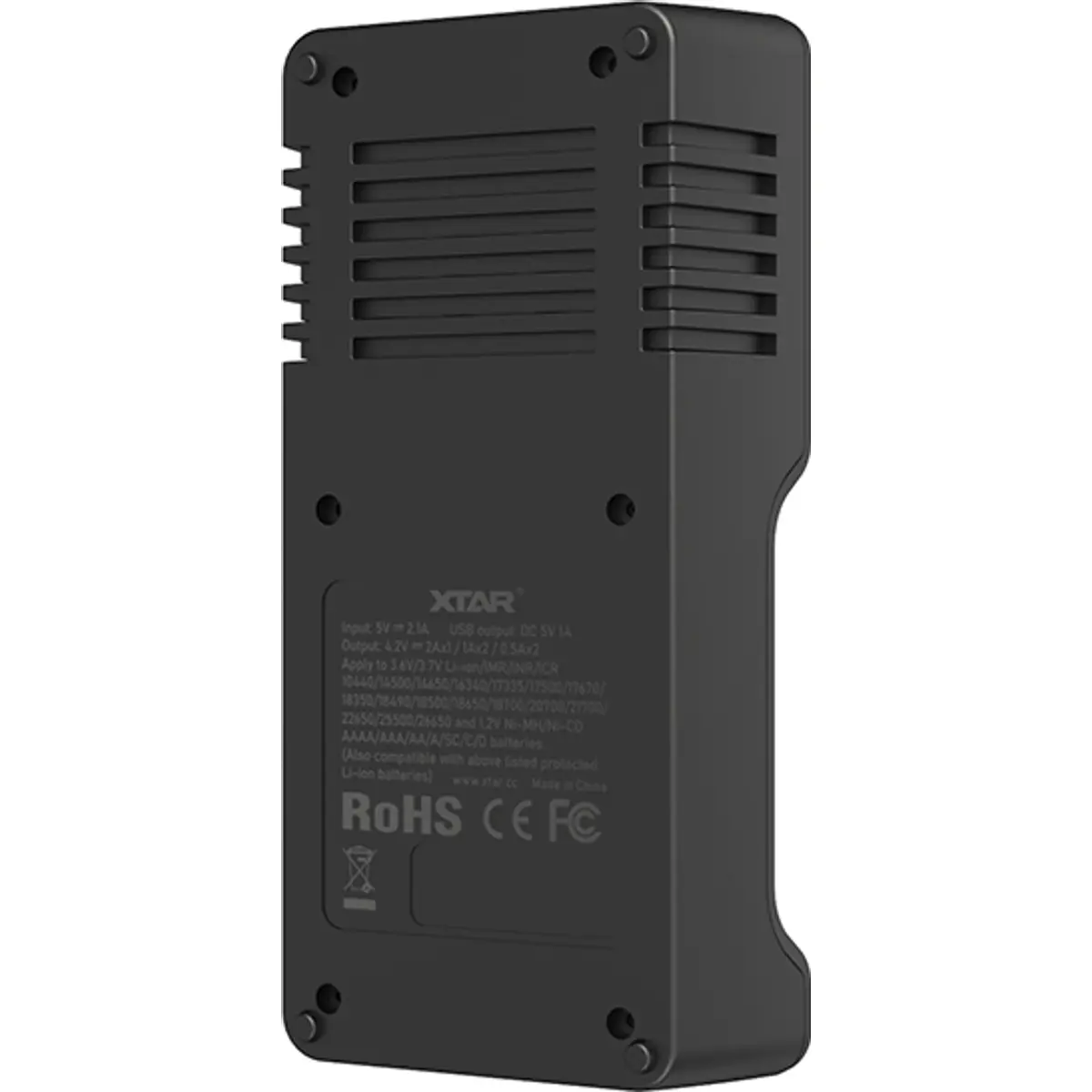 O Xtar VC2SL tem uma função adicional de PowerBank com saída USB de 5 V com potência máxima de 1 A. Qualquer bateria de íon-lítio com capacidade mínima de 2200mAh pode ser usada como fonte de alimentação. Para usar a função Banco de potência, desconecte o carregador da fonte de alimentação e coloque as baterias nele. Quando você conecta o dispositivo à saída USB, o carregador mostrará automaticamente