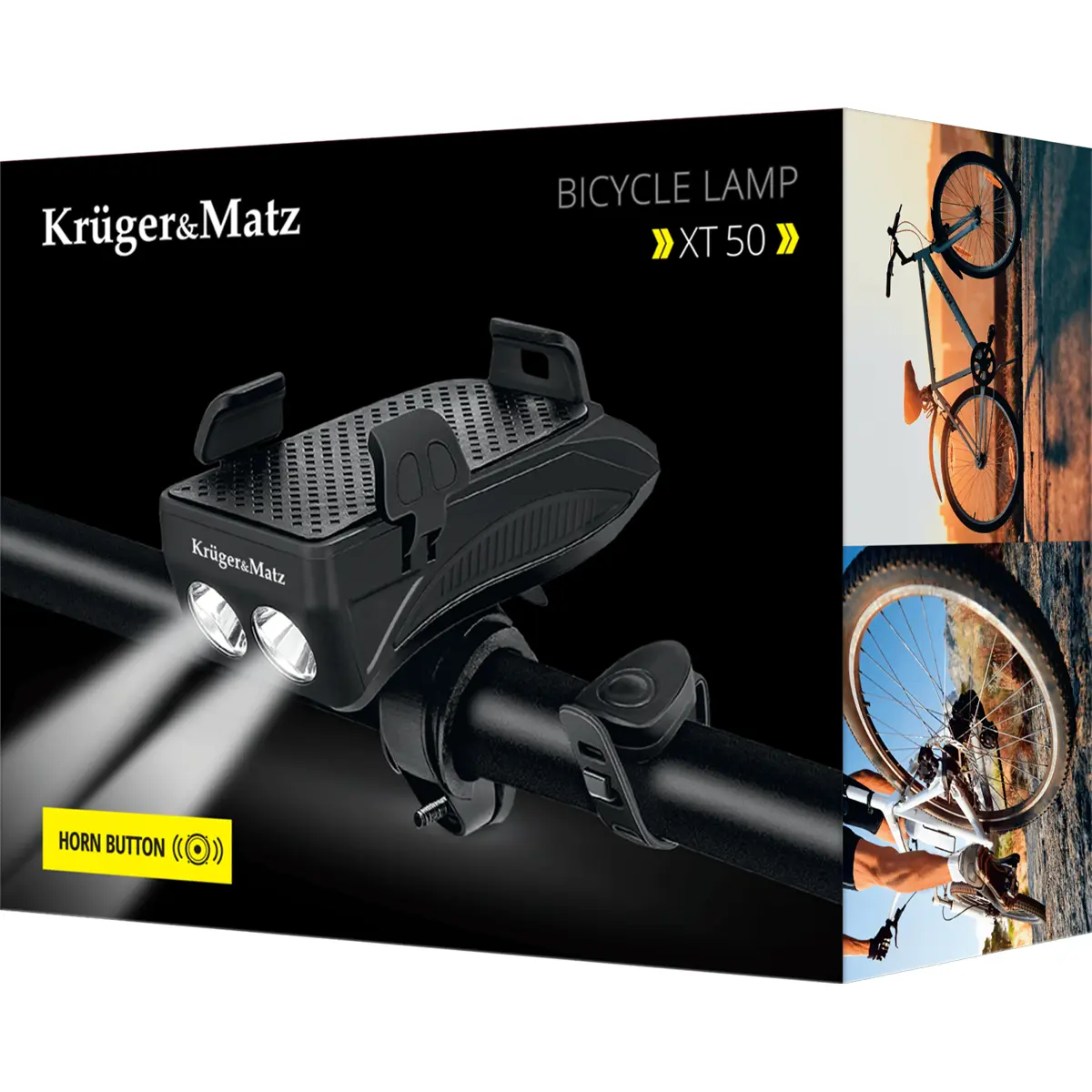 Krüger&Matz MT50 - Suporte de telemóvel para bicicleta 3-em-1 c/ Luz LED + Power Bank + buzina