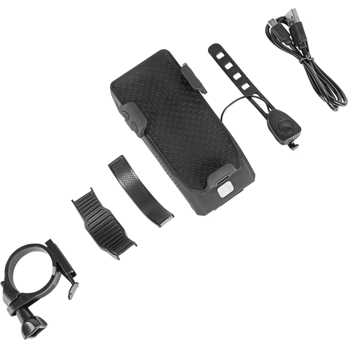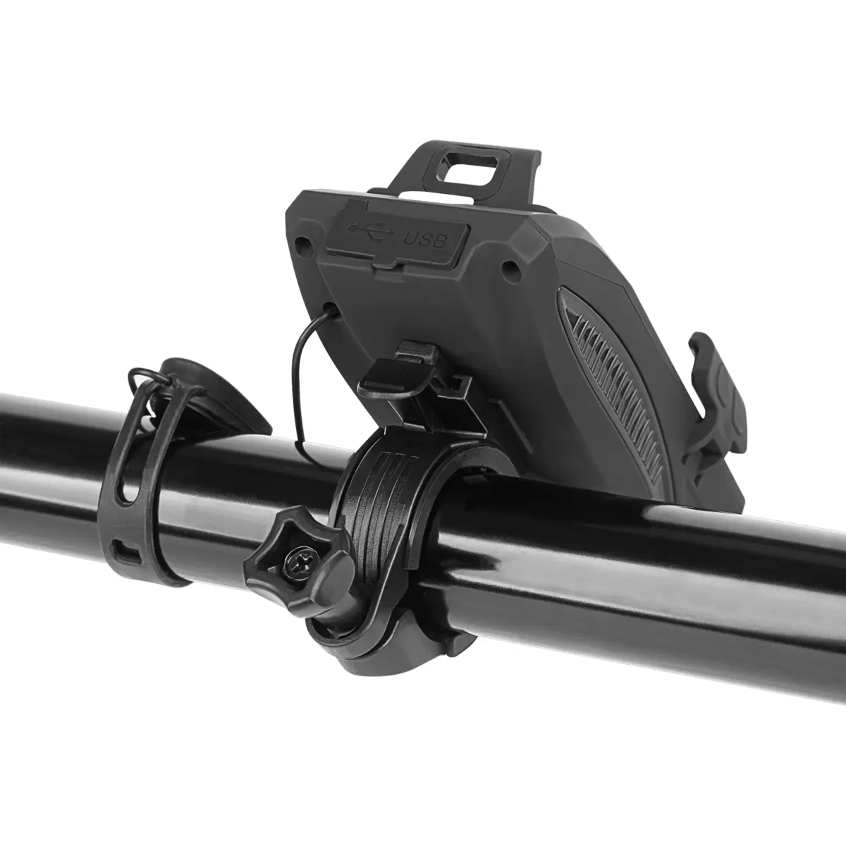 Este suporte de telemóvel para bicicleta 3-em-1 integra iluminação, power bank e buzina, ideal para manter o telemóvel seguro durante passeios. Ajustável para telemóveis até 8,5 cm de largura e quadro de até 3,3 cm, feito em ABS, com dimensões compactas. O farol oferece 3 modos (luz forte, fraca e intermitente) com fonte de luz de 2x5 W e fluxo de 400 lm. O power bank tem 2000 mAh com portas microUSB e USB e corrente de saída de 0,8 A. A buzina oferece 5 sons com volume até 130 dB, com cabo de 37 cm.