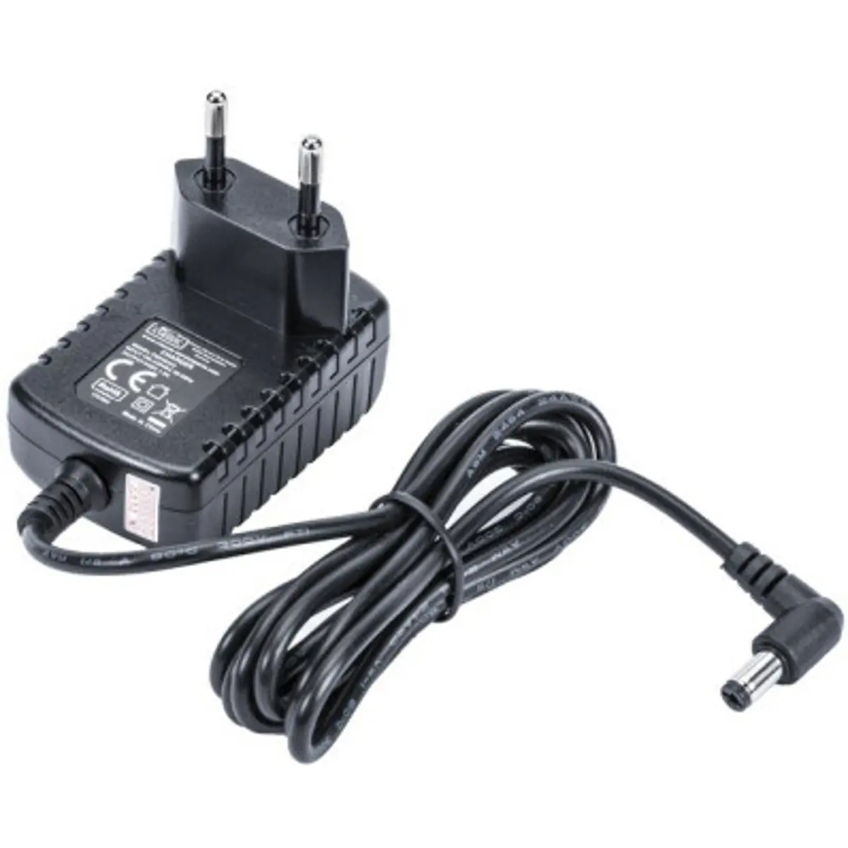 Fonte de alimentação de rede com saída de 5VDC, fornecendo até 1A e 5W. Possui entrada universal 100..240VAC e conector central de 5.5x2.1mm (Ø exterior 5.5mm, Ø interior 2.1mm), adequado para dispositivos que requerem alimentação estável a 5V.