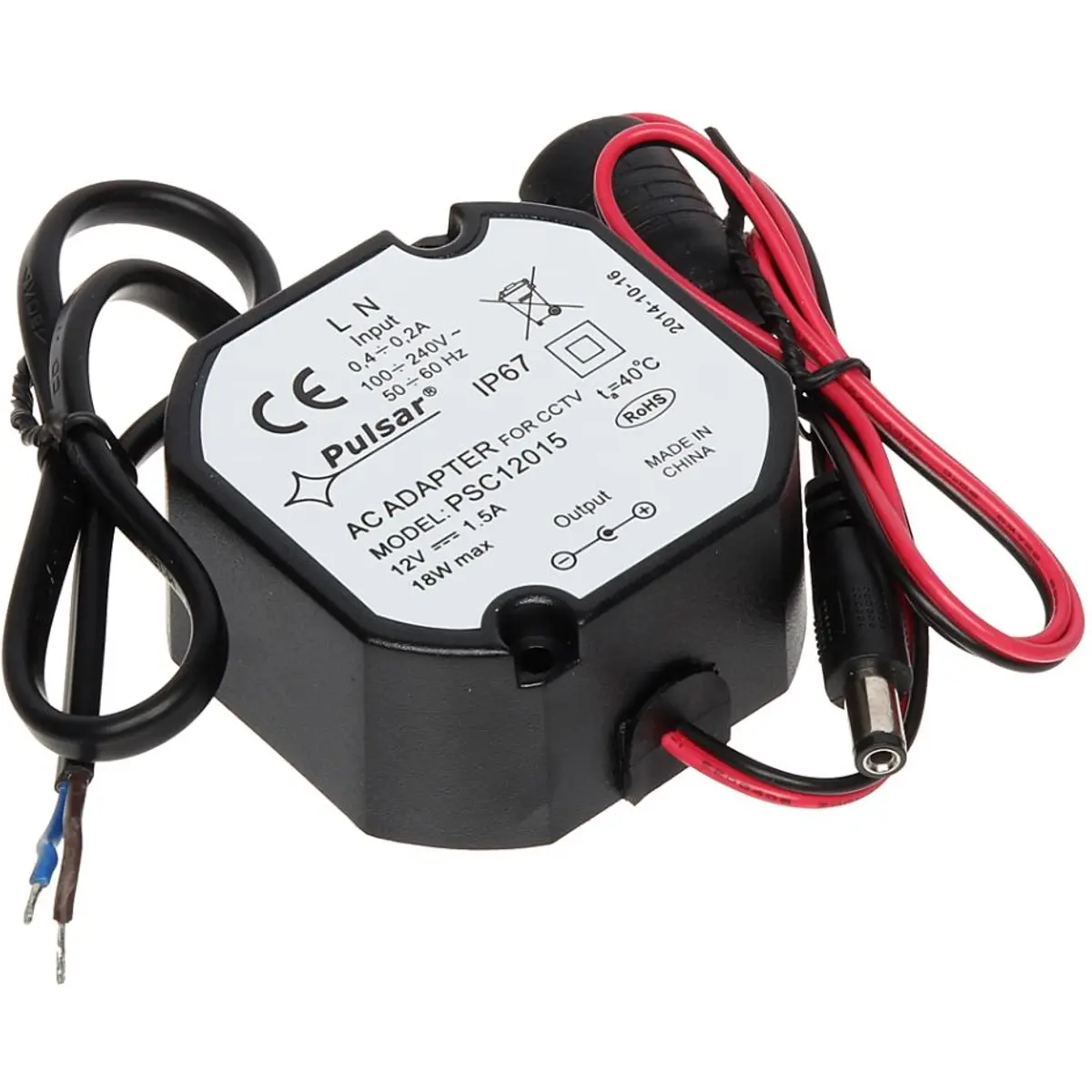 A fonte de alimentação comutada destinada a caixas de embutir fornece 12 V DC a 1,5 A, com uma potência de 18 W e uma única saída. Possui caixa de plástico, conectores de alimentação 2.1/5.5 mm e grau de proteção IP67, adequada para instalação em ambientes interiores ou exteriores protegidos. Com dimensões compactas (58 x 58 x 28 mm) e peso de 0,16 kg, funciona entre 0 °C e 40 °C e inclui proteções contra curto-circuito e sobrecarga.
