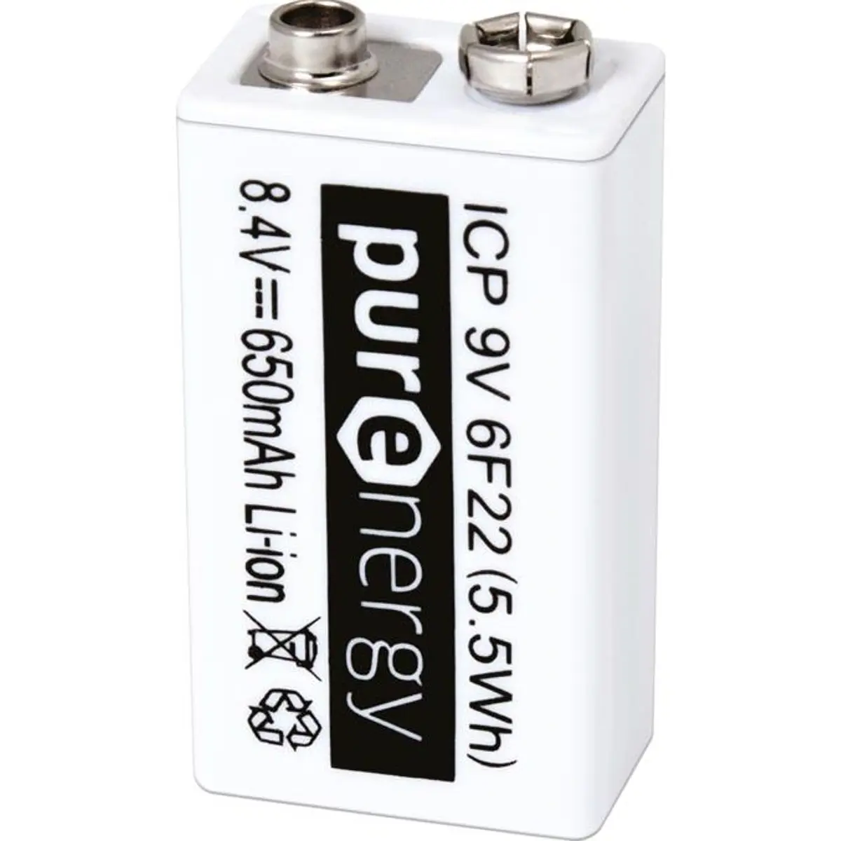 Bateria Li-Ion recarregável com capacidade de 650mAh e tensão de 8.4V (aplicação 9V). Possui dimensões de 26x45.5x16 mm e serve como substituição para baterias de tamanho 9V em dispositivos compatíveis.