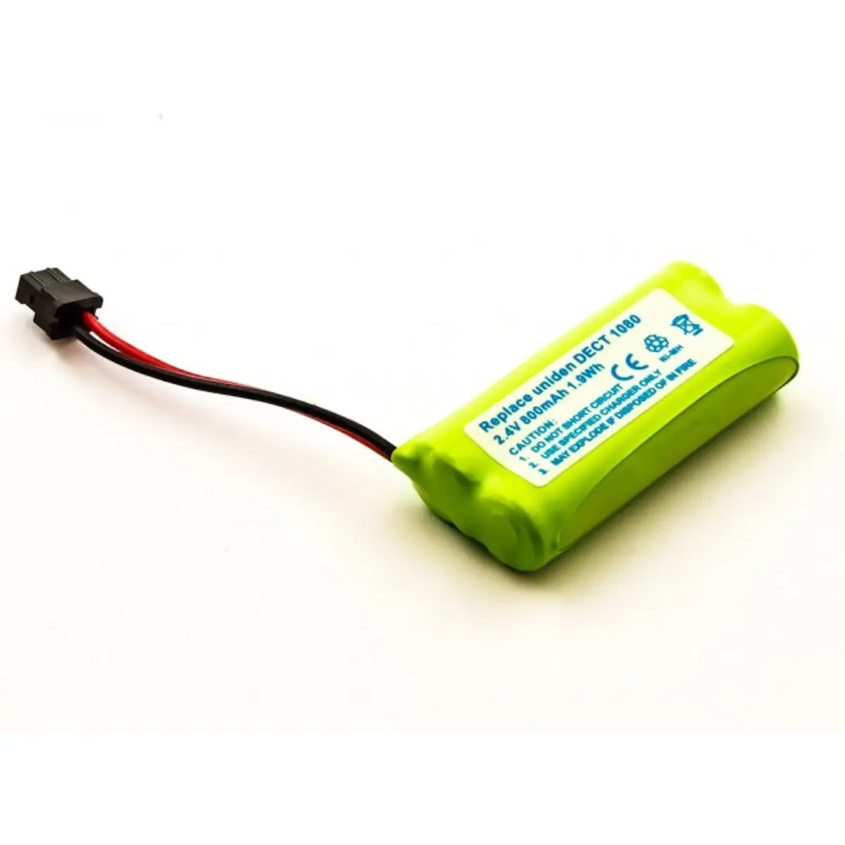 Bateria recarregável NiMH de 2.4V, 800mAh e 1.9Wh, com dimensões de 44.5 x 22.8 x 10.6 mm. Compatível com os modelos BT1002 e CBC1002 (e outros, conforme especificação), oferece substituição direta para dispositivos DECT, boa duração de carga, desempenho estável e fácil reposicionamento. Ideal para telemóveis, bases de telefone sem fios e sistemas de comunicação que utilizem baterias NiMH.