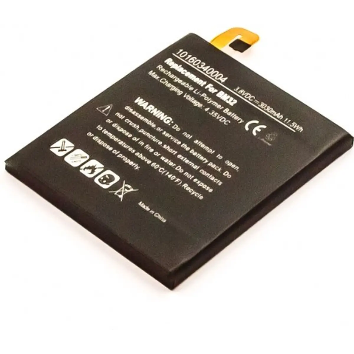 Bateria recarregável de Li-Polymer com 3,8 V e 3030 mAh (11,5 Wh) para telemóveis. Dimensões: 67,3 x 56,2 x 5,5 mm. Compatível com BM32. Oferece substituição simples para aumentar a autonomia, com desempenho estável e instalação fácil, ideal para uso diário.