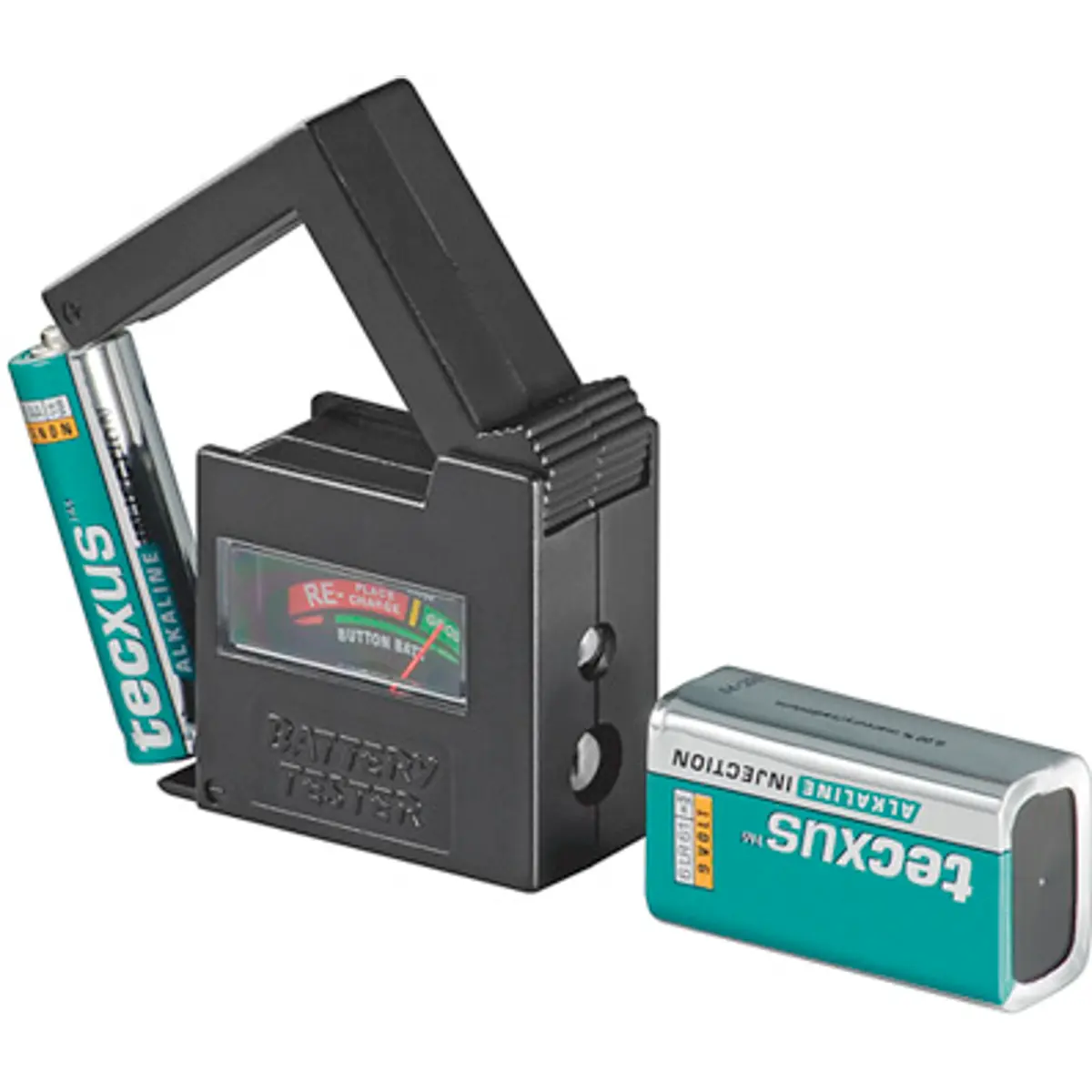 Teste de baterias e pilhas que suporta AAA, AA, C, D, 9V e células de botão, com um mostrador de carga que indica bom estado, descarregadas ou a precisar de carregamento/substituição. Funciona como ferramenta simples, portátil e útil em casa, oficina ou no espaço técnico para monitorizar o estado das baterias.