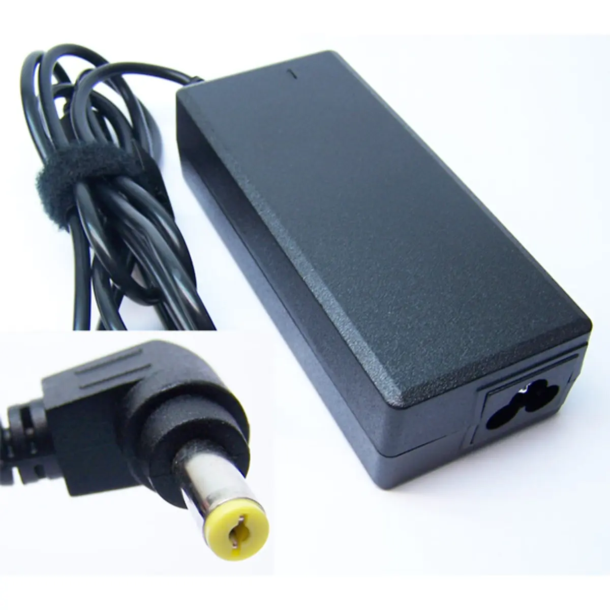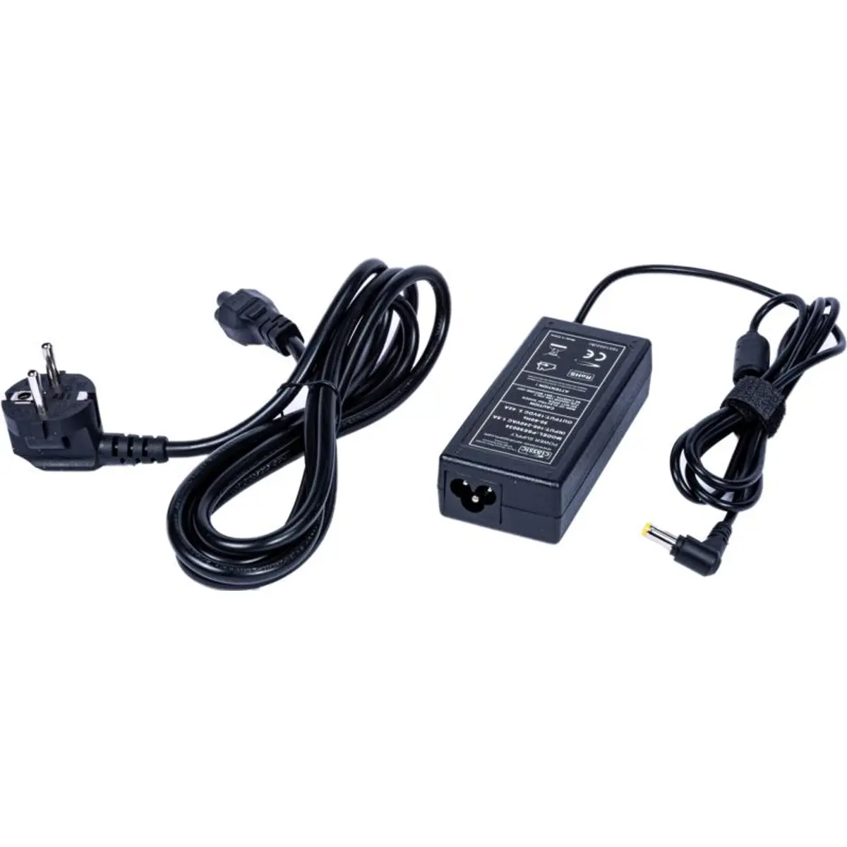 Fonte de alimentação de 19VDC com potência de 65W, adequada para equipamentos que requerem alimentação entre 110 e 240VAC. Garante saída estável de 19VDC com corrente de 3,42A, ideal para dispositivos de baixo a médio consumo. Inclui cabo de alimentação com ficha Schuko e IEC C5, compatível com tomadas europeias. O conector apresenta diâmetros de Ø exterior 5,5mm e Ø interior 1,7mm, assegurando compatibilidade com cabos e adaptadores padrão, sem referência de marca.