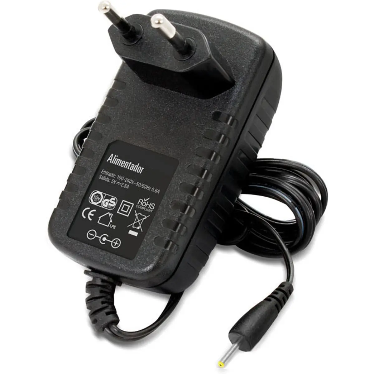 Esta fonte de alimentação universal para tablets oferece entrada 100-240 VAC e saída estável de 5 V DC, com corrente até 2,5 A e potência de 12,5 W. O conector da ficha tem Ø exterior de 2,5 mm e Ø interior de 0,75 mm, comprimento 10,7 mm, com dimensões do corpo 90 x 45 x 70 mm. Compacta e segura, indicada para carregamento de tablets em casa, escritório ou em viagem, com boa eficiência energética e compatibilidade internacional.