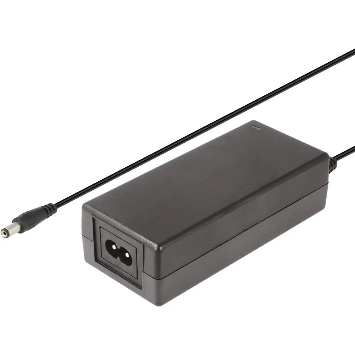 Fonte de alimentação em corrente contínua de 24VDC, 2,0A e 48W, com entrada universal 110-240VAC. Possui conector com Ø externo de 5,5 mm e Ø interno de 2,1 mm, comprimento de 12 mm, adequado a uma variedade de dispositivos DC para uso em ambientes domésticos ou industriais.