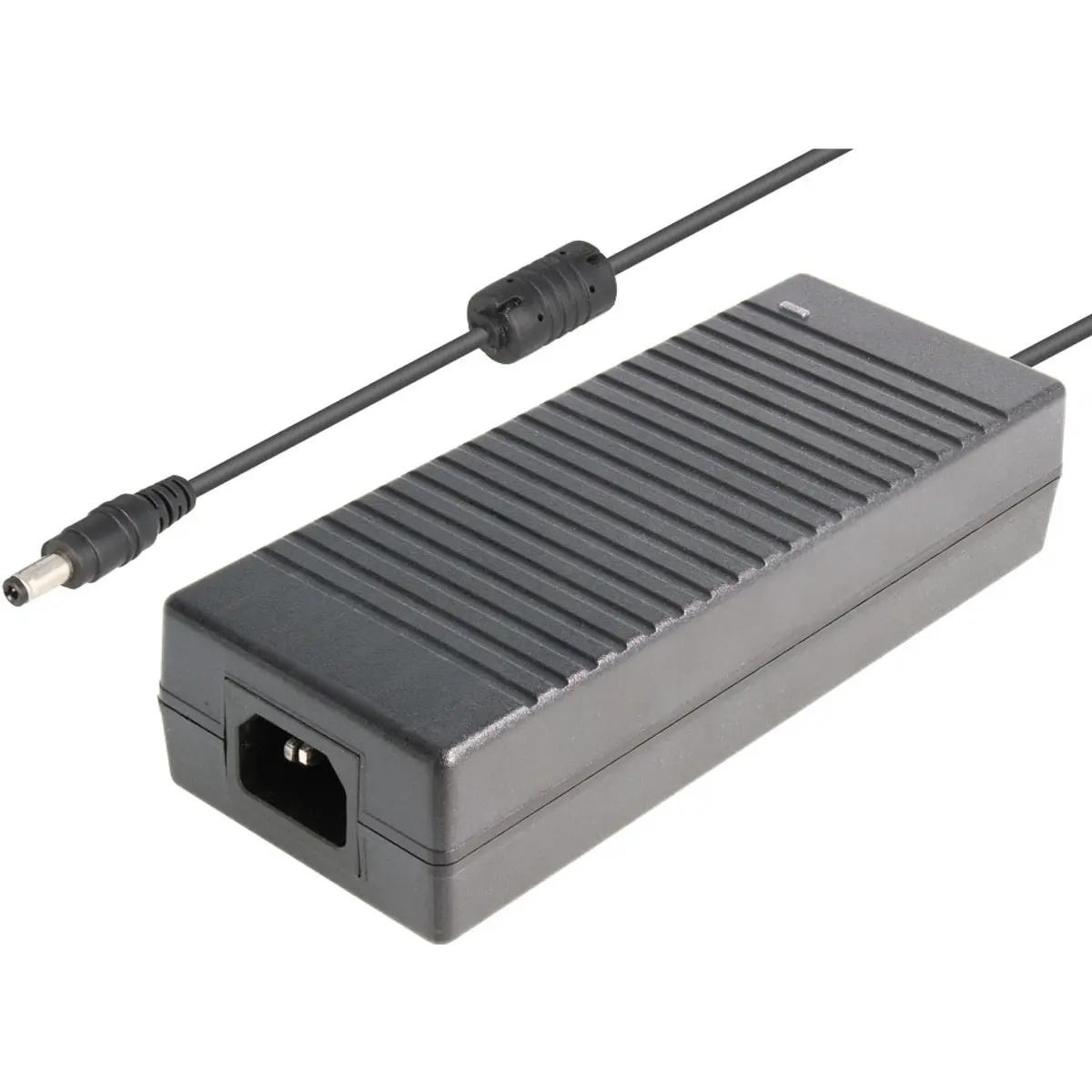 Fonte de alimentação DC de 24 V com capacidade de até 5 A e 120 W, alimentada por rede 110-220 VAC. Inclui cabo de alimentação IEC 60320-C7. Dimensões compactas (156 x 64.3 x 38.3 mm) com conector de saída de 5.5 x 2.1 mm, adequada para equipamentos de automação, controlo e aplicações de baixa tensão que exigem fiabilidade e uma fonte de alimentação estável.