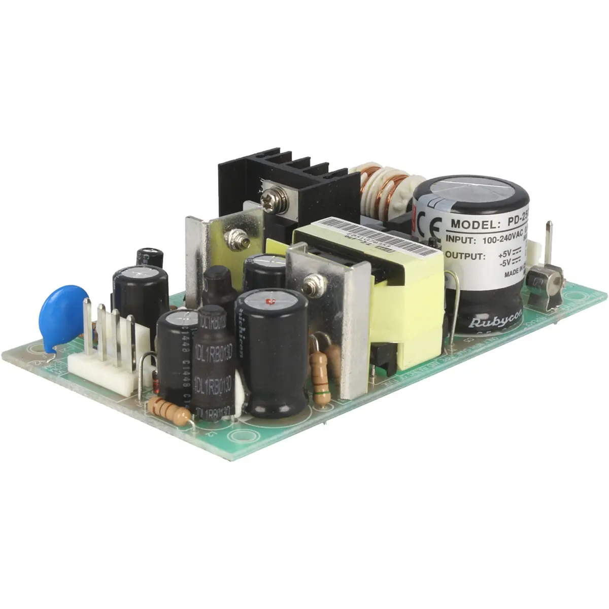 Fonte de alimentação DC com duas saídas de 5V e -5V, capaz de fornecer até 2,5 A por saída, totalizando 25 W. Possui faixa de entrada ampla de 120-370 VDC ou 90-264 VAC. Eficiência de 73% e proteções contra sobrecorrente, sobreaquecimento, sobretensão e curto-circuito. Funciona entre -10 e 60 °C, com ficha raster de 3,96 mm. Dimensões compactas (107 x 61 x 28 mm) e peso de 150 g, adequada a montagem em espaços restritos e bancada.