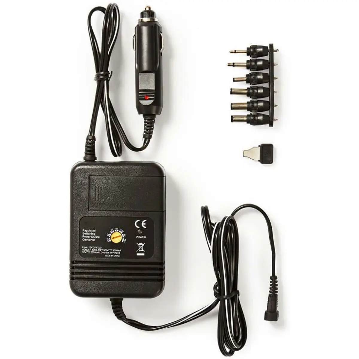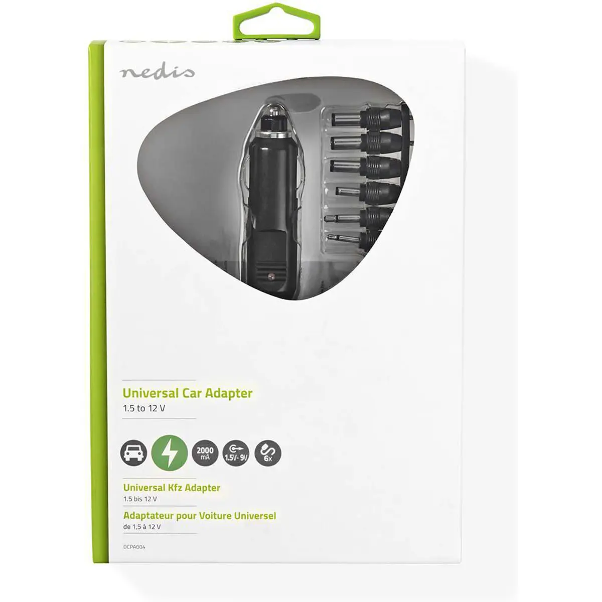 Nedis DCPA004 - Fonte de alimentação c/ ficha isqueiro 12..24VDC > 1,5/3/4,5/6/7,5/9/12V DC 6W 2.0A + 6 adaptadores DC