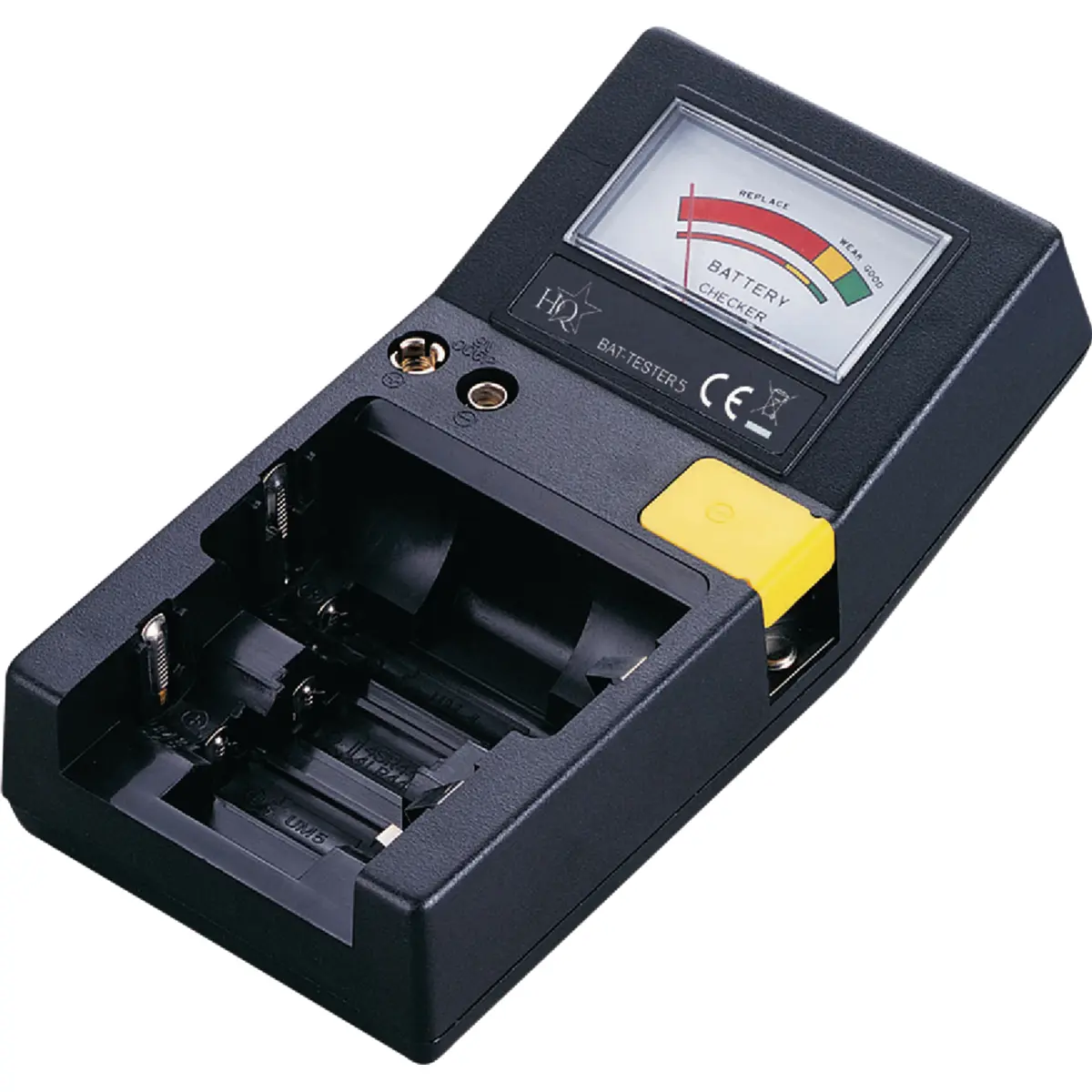 Pode-se testar uma pilha de cada vez e o nível de carga é indicado por um ponteiro analógico.