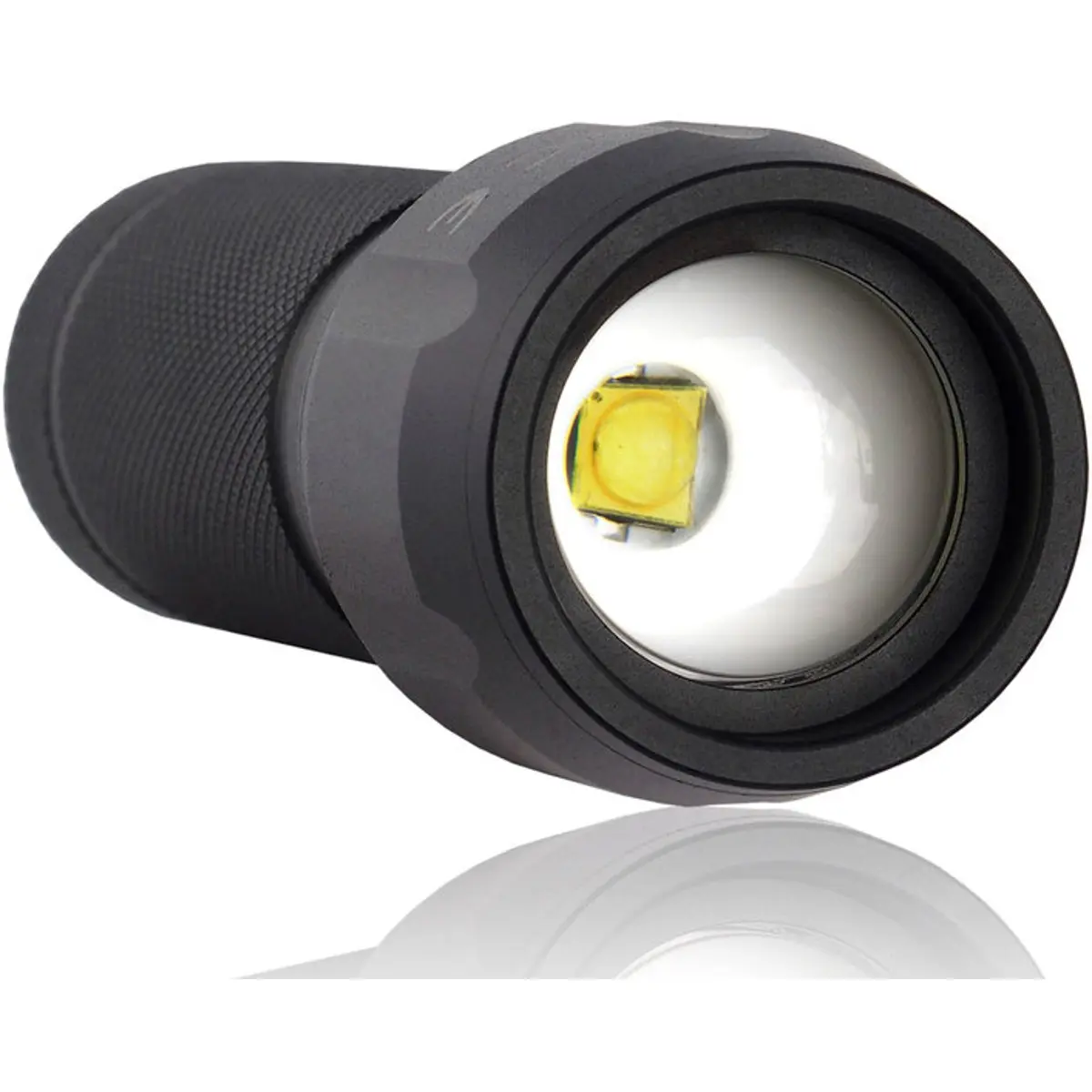 A lanterna possui 3 modos: 100%, 25% e intermitente, uma lente que gera um feixe de luz uniforme e a capacidade de ajustar suavemente o foco do feixe de luz.