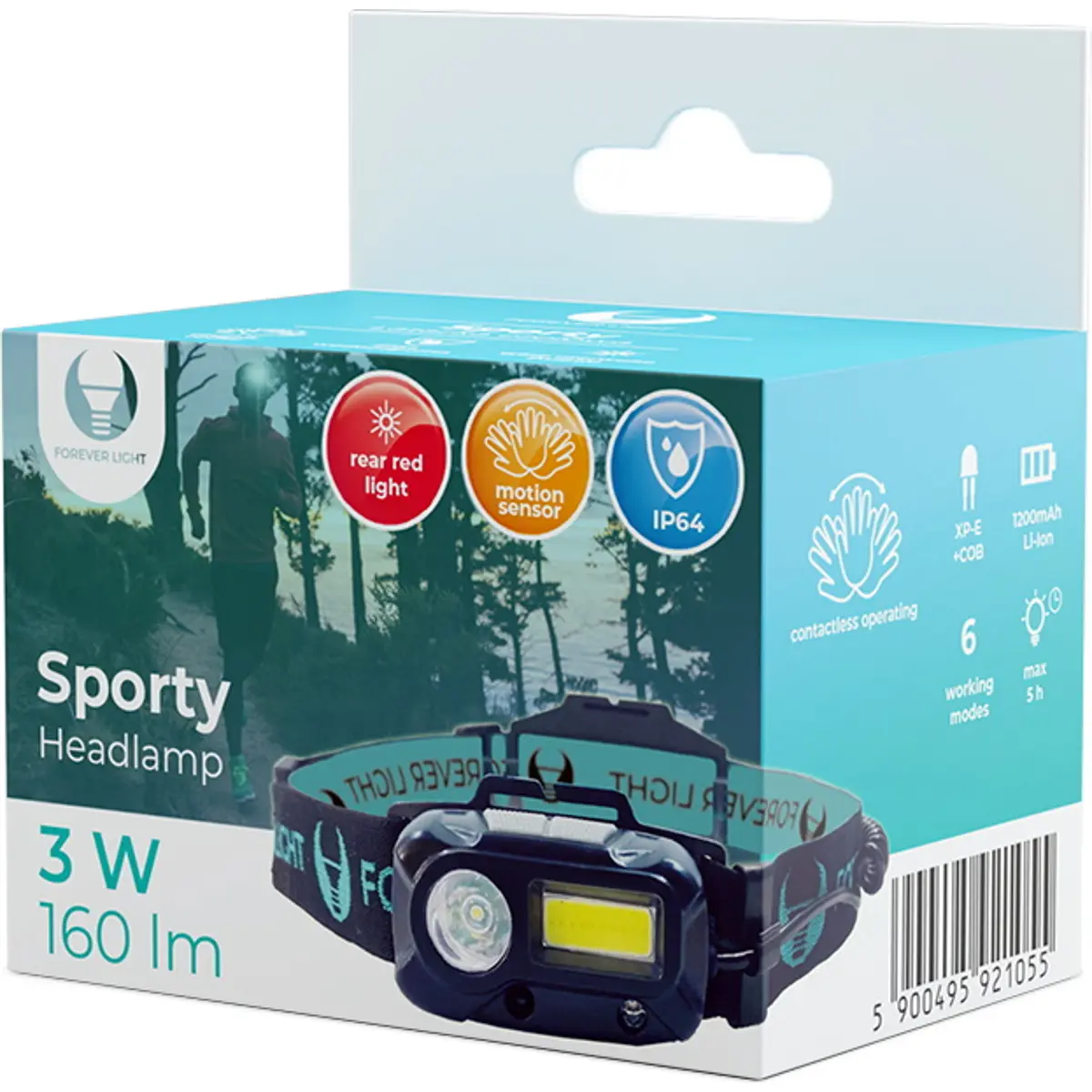 Lanterna de cabeça com luz traseira vermelha é a escolha perfeita para uma corrida noturna ou um passeio de bicicleta. Também será útil para acampar ou consertar um automóvel à noite. A lanterna possui dois LEDs embutidos: XP-E 160lm e COB 80lm e uma luz traseira vermelha funciona do mesmo modo que a luz frontal. O LED XP-E emite uma luz projetora, intensa e focada, enquanto o LED COB oferece uma luz ampla e difusa. Uma opção adicional é a operação sem contato da lanterna usando um sensor de movimento na parte de baixo da lanterna.