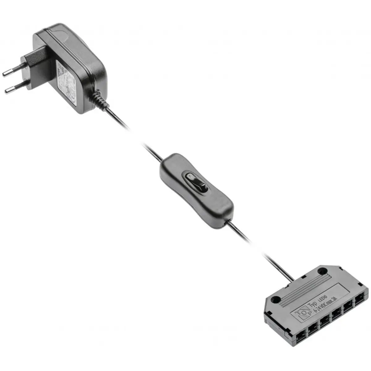 Fonte de alimentação de 12 V DC para ligações LED com 6 saídas, potência 12 W e corrente máxima de 1 A, com entrada 220-240 VAC. Compatível com os modelos 306-4980, 306-4978 e 306-4979; equipada com interruptor.
