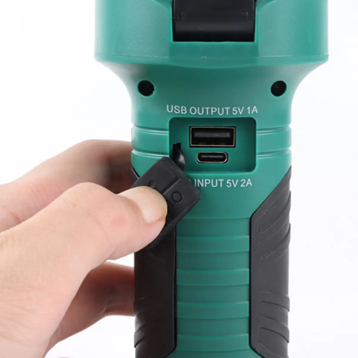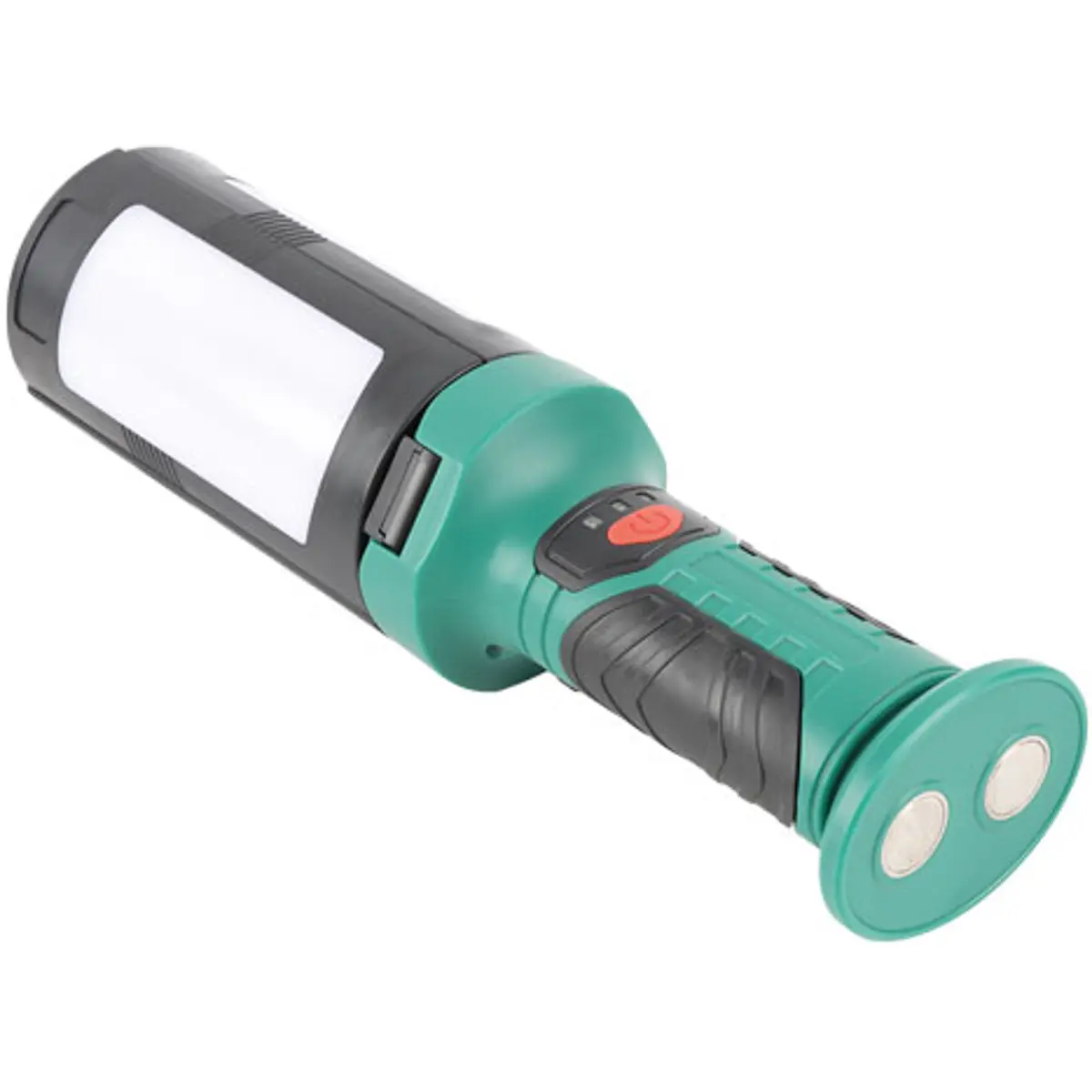 Lanterna de trabalho com potência dupla LED 1W/5W, oferecendo até 600 lm (SMD) e 150 lm (LED), com alcance de iluminação de 100 m. Possui modo múltiplo (100% LED, LED+SMD em 10%, 60%, 100% e FLASH); powerbank integrado de 2200 mAh; recarregável via Micro-USB ou Type-C em 4-6 h; autonomia de 5-8 h. Estrutura em ABS, com magnet na base, cor preta/verde, 3 braços e gancho para pendurar. Ideal para trabalho em obra, manutenção e emergências.