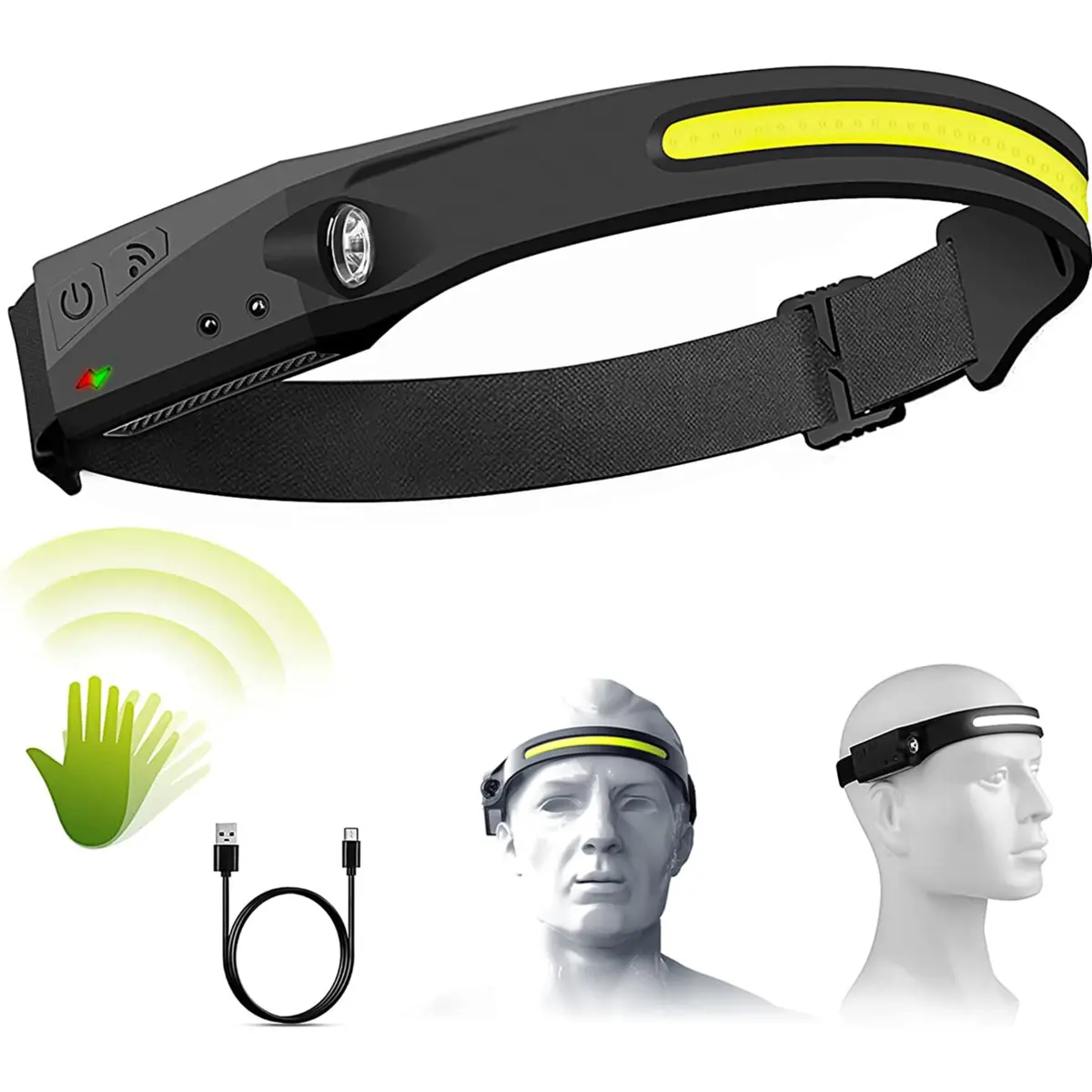 Lanterna de cabeça LED recarregável com potência de 5W, iluminação por COB e XPE, com modos COB 100%, COB 50%, XPE 100% e XPE 50%. Atinge 300lm, tem bateria de 1200mAh com carregamento USB tipo C, autonomia de 2 a 3 horas e proteção IPX4. Oferece ajuste de fita regulável e distância de iluminação de até 65 metros. Ideal para atividades noturnas com sensor de micro-ondas que facilita o uso sem as mãos.