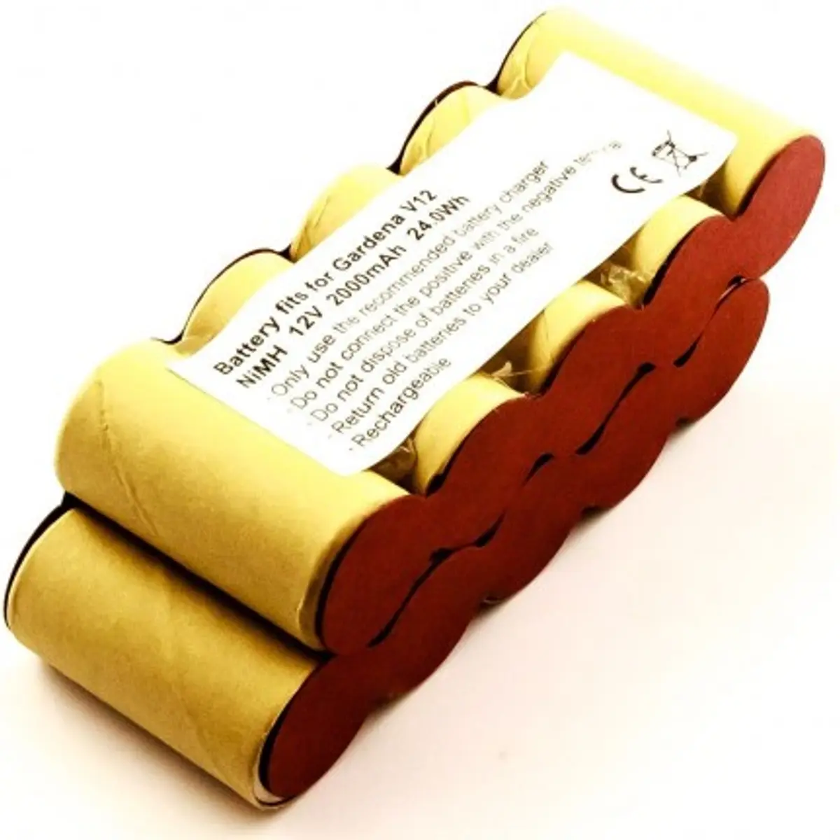 Bateria de reposição de 12V com capacidade de 2000mAh e 24Wh em NiMH. Compatível com Gardena V12, com dimensões de 123,8 x 43,6 x 42,0 mm e referências originais 2110, 62901. Destinada a substituir baterias originais em sistemas que utilizam o formato V12.