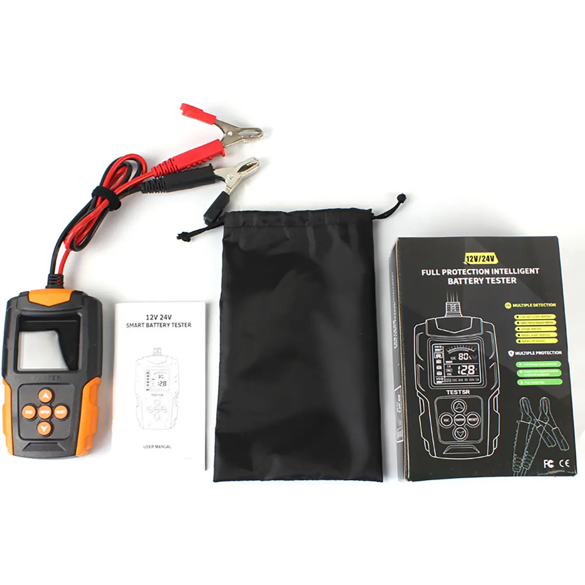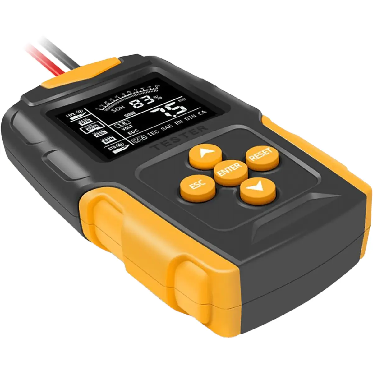 Este testador digital de baterias mede 12V e 24V, reportando voltagem, estado de carga (SOC) e desgaste (SOH), com teste de corrente de arranque e de carga, além do funcionamento do alternador. Adicionalmente, avalia a resistência interna. Compatível com baterias Pb/AGM/GEL/EFB, cobre faixas de capacidade 2-220Ah, tensão de entrada 6-16V, e leitura de 8-30VDC, com faixa de teste de 3-200Ah. Emite resultados SOH, SOC, CCA e IR, segundo SAE, DIN, IEC, EN, CA, JIS.
