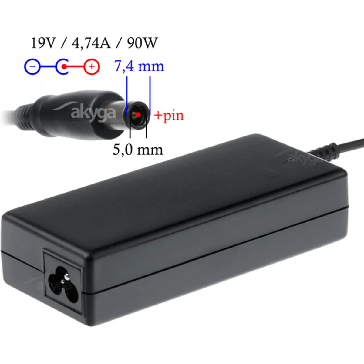 Fonte de alimentação 19VDC de 90W, com entrada de 110-240VAC e saída estável a 19VDC. Oferece 4.74A de corrente de saída para dispositivos que exigem conectores de Ø exterior 7.4mm e Ø interior 5.0mm com pino central. Ideal quando se requer uma fonte de alimentação confiável para equipamentos que utilizam pino central (Sens-Pin) e especificação 19VDC.