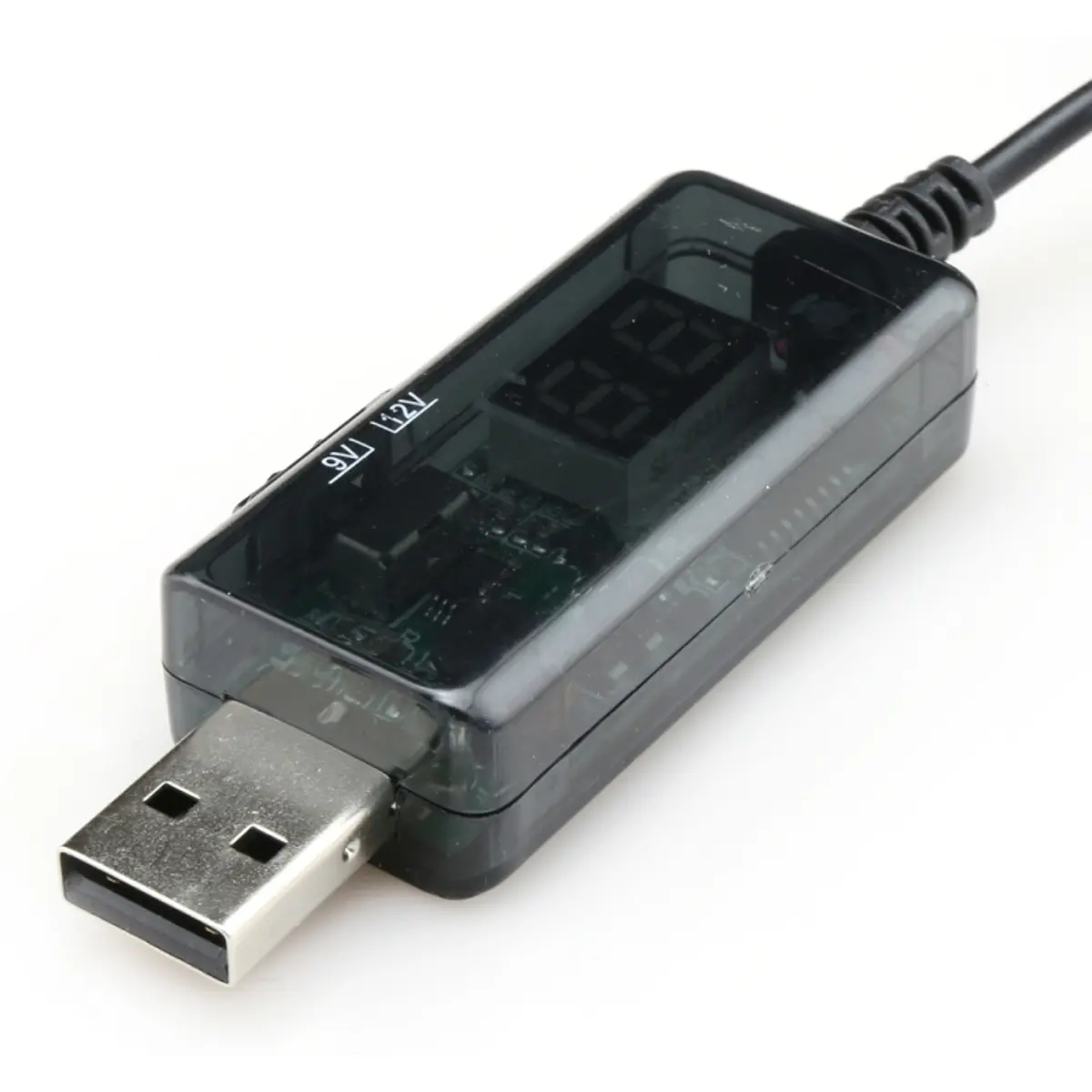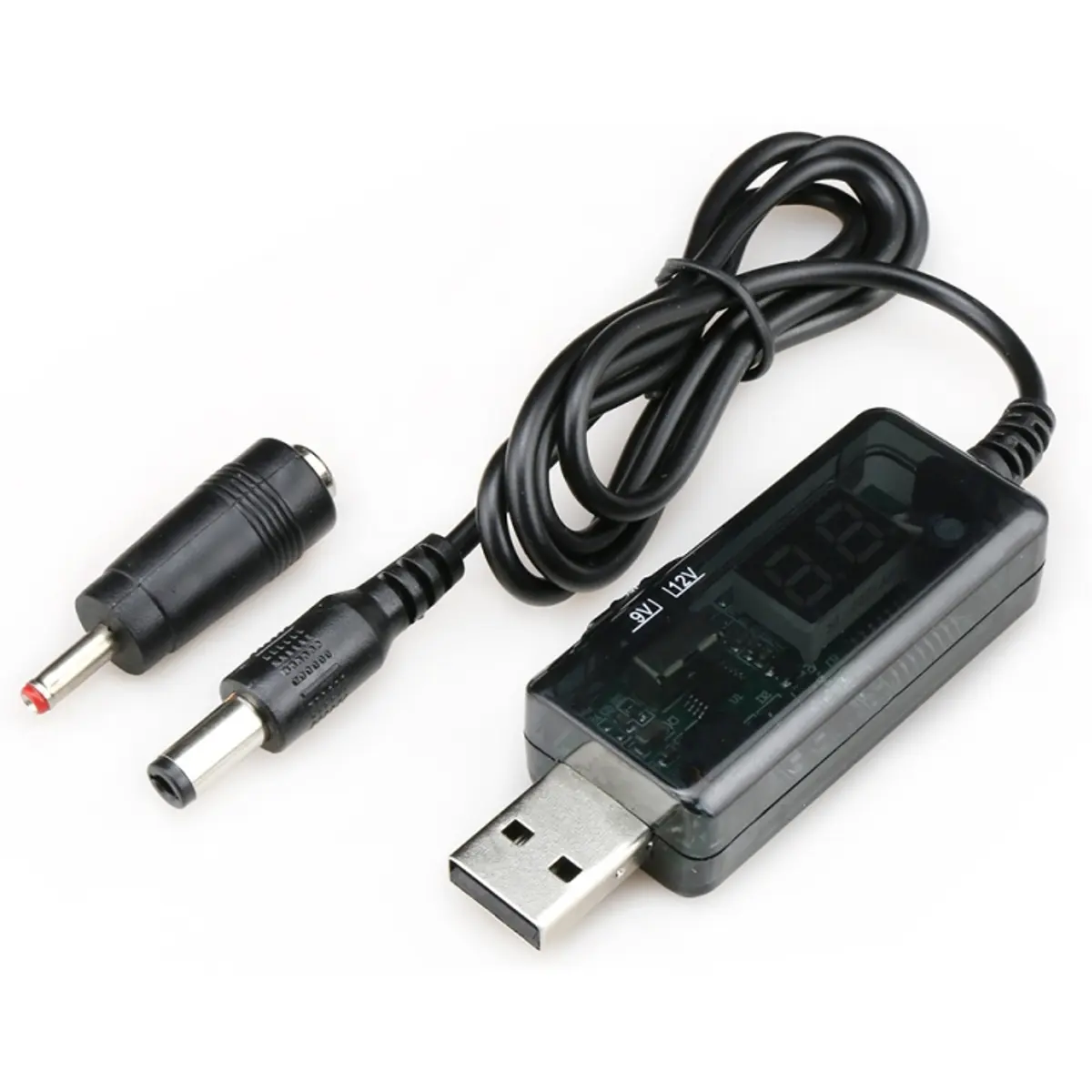 Este cabo-conversor USB transforma 5V de uma porta USB em 9V ou 12V, com corrente máxima de 1A. O cabo possui 0,8 m de comprimento, ficha DC 5,5 x 2,1 mm e adaptador para 3,5 x 1,35 mm, com interruptor de seleção de tensão. Pode ser ligado a PC ou a carregador USB de telemóvel, oferecendo alimentação estável para dispositivos que exigem essas tensões a partir de USB.