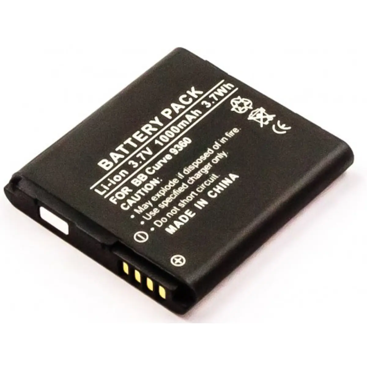 Bateria de substituição compatível com BlackBerry Curve 9370, Curve 9360 e Curve 9350, com 3,7 V, 1000 mAh e 3,7 Wh Li-Ion. Substitui as baterias BAT-34413-003, ACC-39508-201, EM1 e ACC-39508-301. Dimensões compactas de 42,2 x 39 x 5,7 mm e peso de 21 g facilitando a instalação.