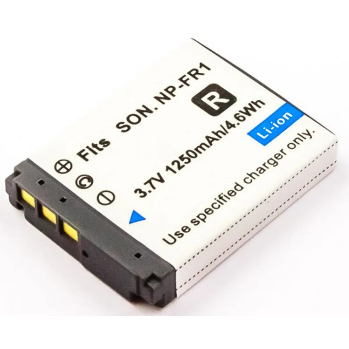 Bateria de substituição para câmaras compatível com Sony NP-FR1, com 3.7V, 1250mAh e 4.6Wh de energia em Li-Ion. Cinzento escuro, dimensões de 46x35.7x8.3mm e peso de 33g. Ideal para reposição rápida de energia durante gravações e para garantir compatibilidade estável com equipamento Sony NP-FR1.