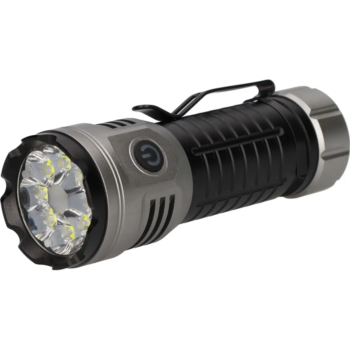 Lanterna LED recarregável de mão com 30W de potência e 3000 lúmenes, fabricada em alumínio, bateria de 2600mAh e carregamento via USB-C. Ofere vários modos de iluminação (baixo, médio, alto, muito alto, turbo; flash rápido, lento e vermelho), alcance de iluminação de até 214 metros, autonomia entre 3 e 7 horas e tempo de carregamento de aproximadamente 4 horas. Compacta, leve e com clip e íman, é ideal para uso externo, caminhadas, pesca e trabalhos noturnos.
