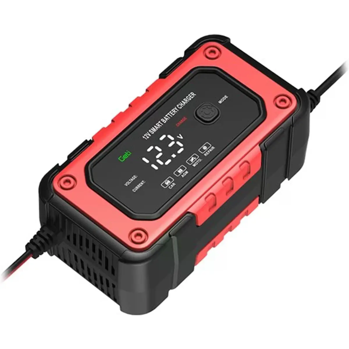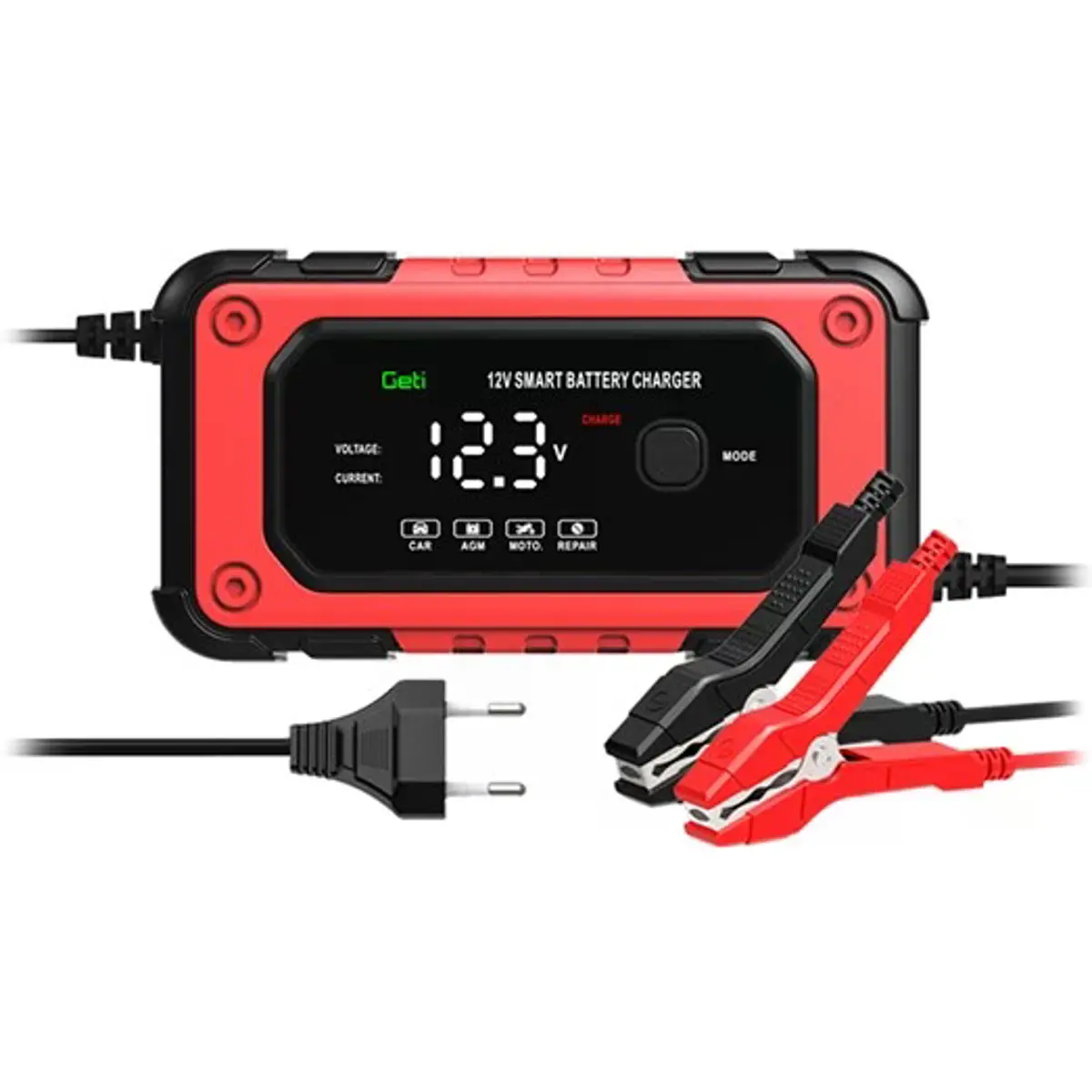 O carregador GETI GCA001 é um carregador de bateria automático e inteligente, desenvolvido para carregar e manter vários tipos de baterias de chumbo-ácido, como AGM, GEL, SLA, EFB, WET, entre outras. Estas baterias são utilizadas em veículos, motas, barcos, UPS etc.. O carregador faz automaticamente o diagnóstico do estado da bateria, seleciona a voltagem de carga adequada e inicia o processo de carregamento. No final do carregamento, o carregador entra em modo de manutenção, prevenindo que a bateria seja danificada por sobrecarga e mantendo-a carregada e pronta para uso. O grande display LCD fornece uma visão geral do estado de carga, voltagem, corrente e outros parâmetros importantes, permitindo um fácil acompanhamento do processo de carregamento. O carregador é adequado para baterias de 12V e oferece várias funções importantes, como um retificador controlado por microprocessador, garantindo total segurança no uso, carregamento personalizado para cada tipo de bateria e desligamento automático após o carregamento completo, mantendo a bateria pronta. A conexão do carregador é simples e rápida, bastando ligar as pinças aos terminais da bateria. O conector vermelho é ligado ao polo positivo e o preto ao polo negativo. Após conectar o carregador à fonte de alimentação e selecionar o modo adequado, o carregador está pronto para carregar.