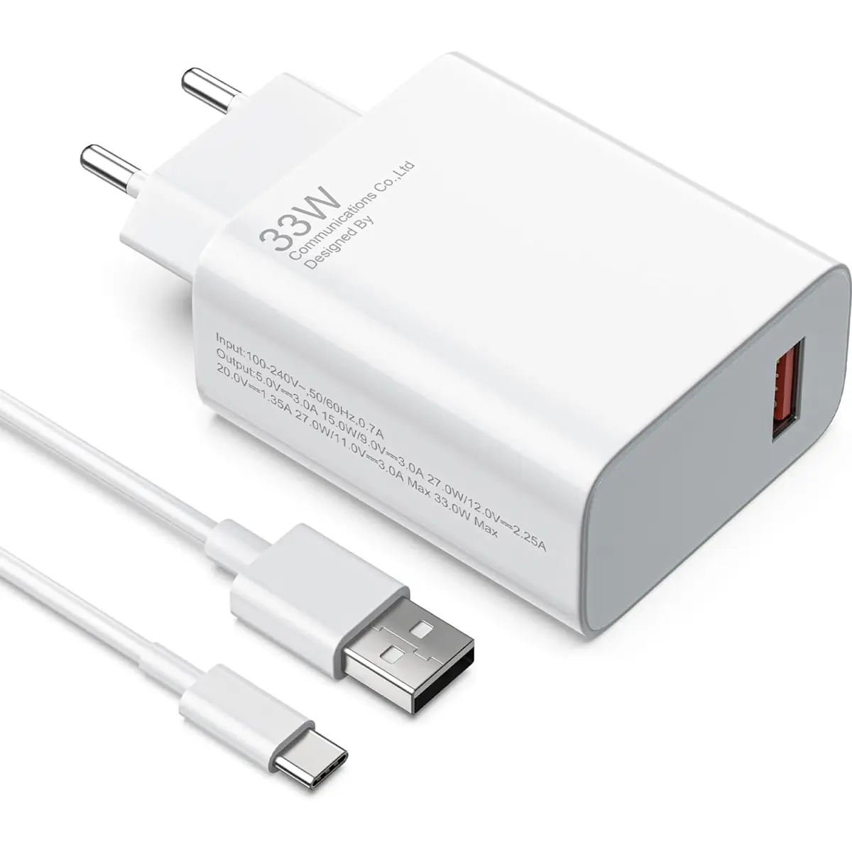O adaptador de corrente com carregamento rápido de 33W é uma solução compacta e potente para carregar rapidamente os seus dispositivos. Este carregador com ligações USB-A para USB-C suporta protocolos de carregamento rápido, incluindo Quick Charge (QC). É compatível com uma vasta gama de smartphones, tablets e outros dispositivos eletrónicos. O cabo USB-A para USB-C incluído assegura uma conexão estável e eficiente, permitindo carregar os seus dispositivos com rapidez e segurança.