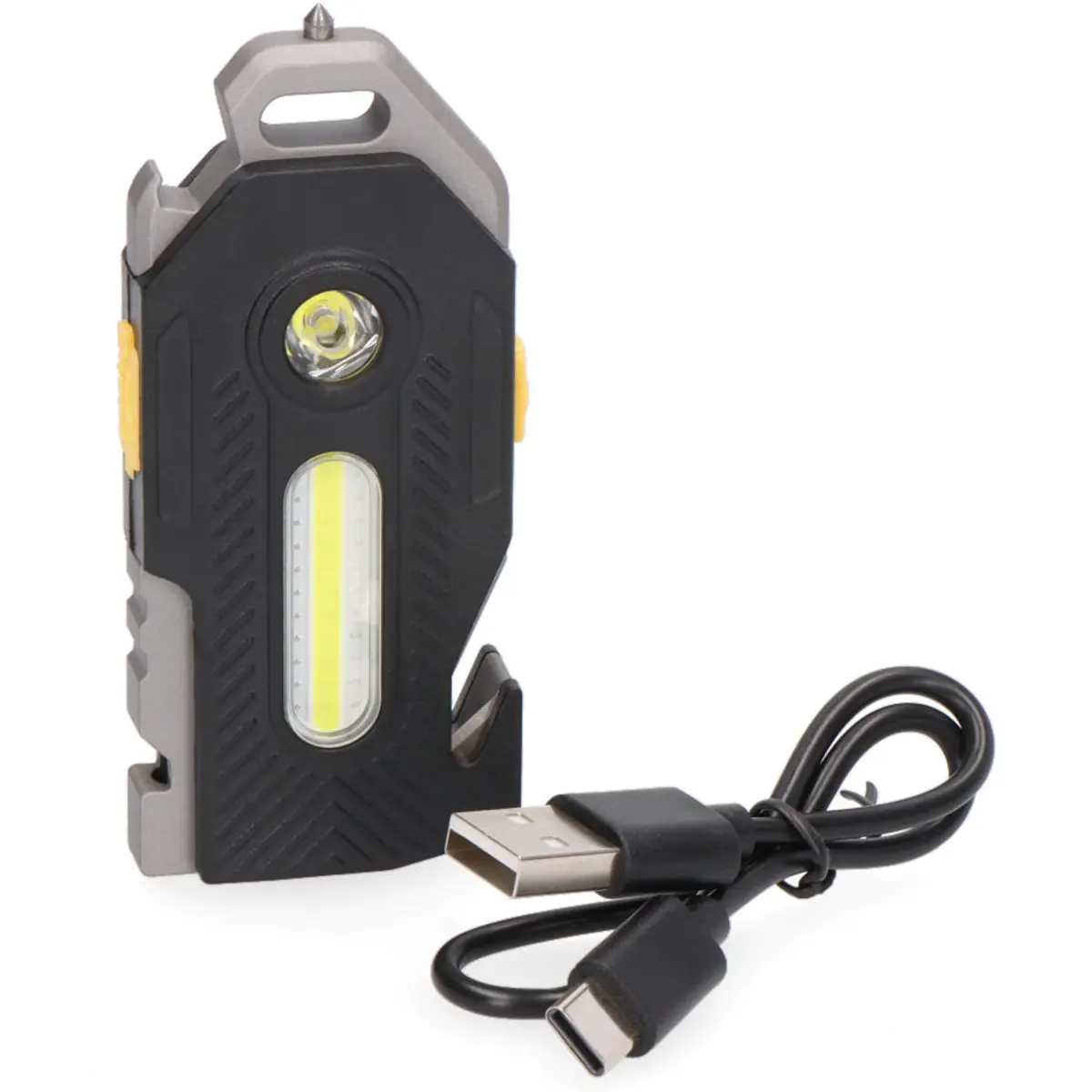 Lanterna LED COB multifunções de alta potência para profissionais e uso ao ar livre, com LED COB de 10W (principal) e 7W (secundário), gerando até 400 lm (principal) e 250 lm (secundário). Recarregável via USB-C, bateria Íon-Lítio 3,7V 300 mAh, autonomia até 2h e tempo de carga de 2 a 4h. Modos Alto, Médio e Flash, com íman traseiro, gancho, corta cintos, quebra vidros, clip, apito de emergência, chave de fenda e chave de estrela. Estrutura ABS/policarbonato, IP44, preto com detalhes laranja.