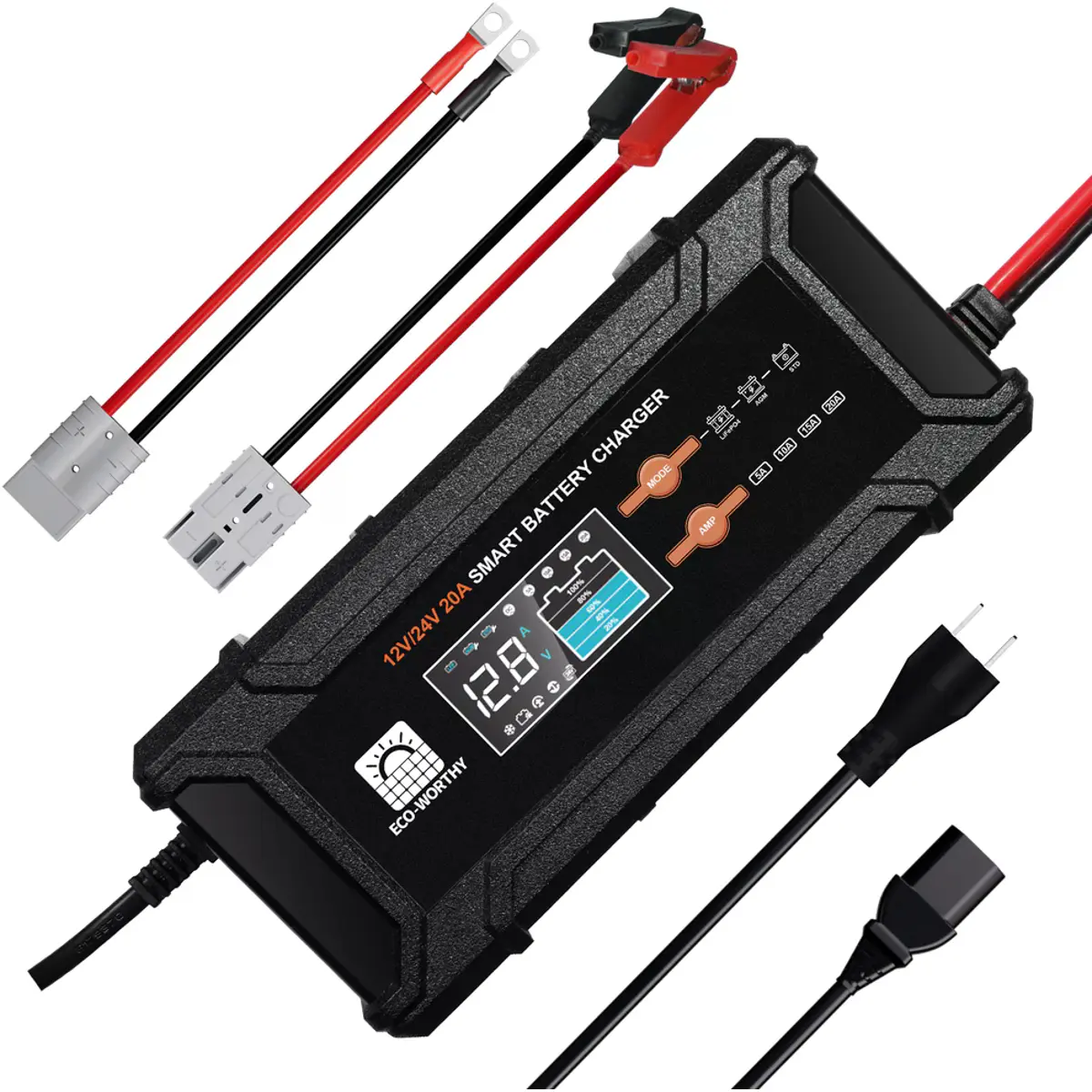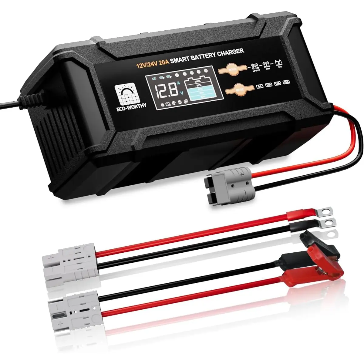 ECO-WORTHY - Carregador Inteligente de Baterias (10-300Ah) 12V/20A 24V/10A com Ecrã LCD