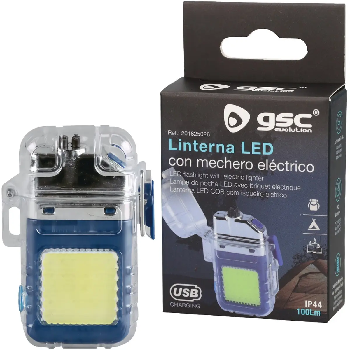 Isqueiro de plasma recarregável à prova de água com iluminação LED COB, carregamento USB-C e proteção IP44. Possui três modos de iluminação, alcance de até 30 metros, autonomia de até 3 horas e bateria de polímero de 300 mAh. Inclui cabo USB-C, é resistente a salpicos e fabricado em PC azul, ideal para atividades ao ar livre.