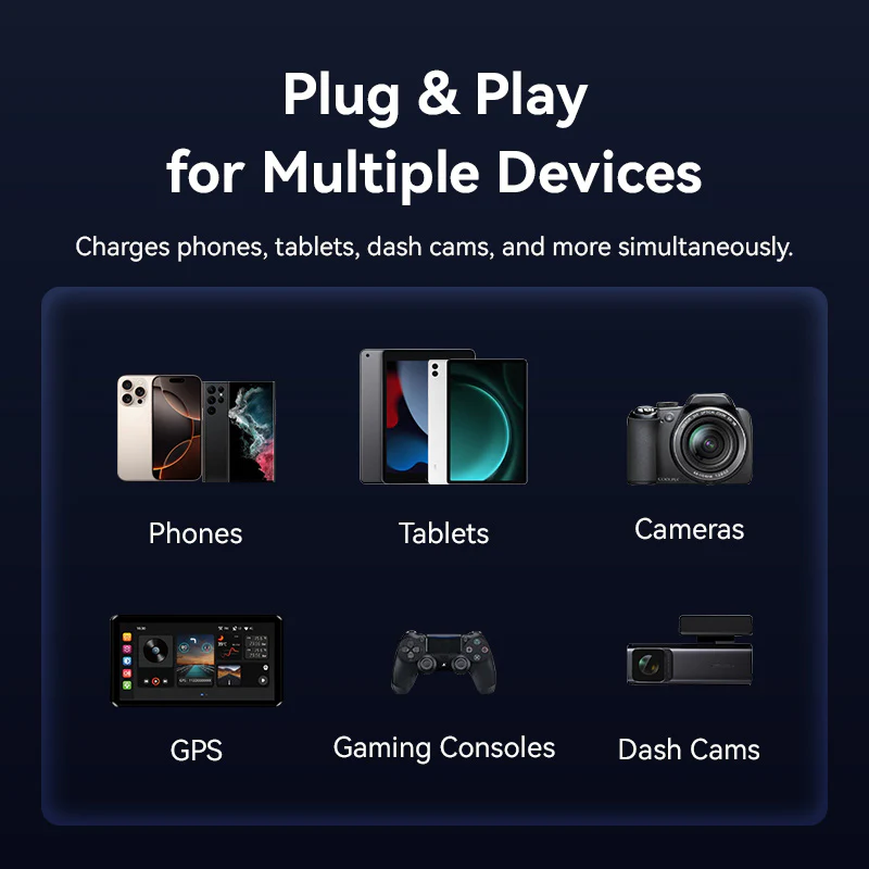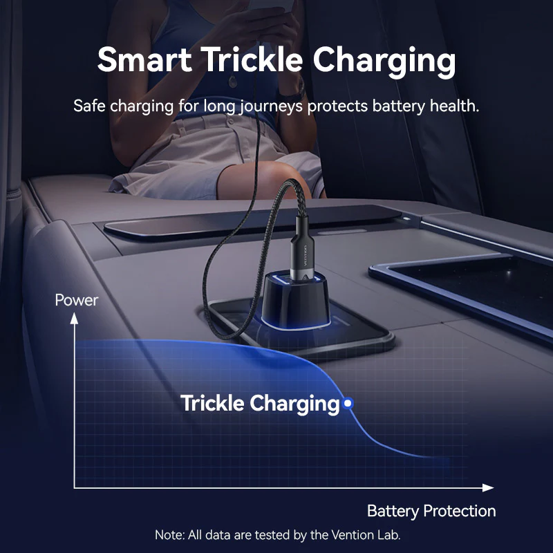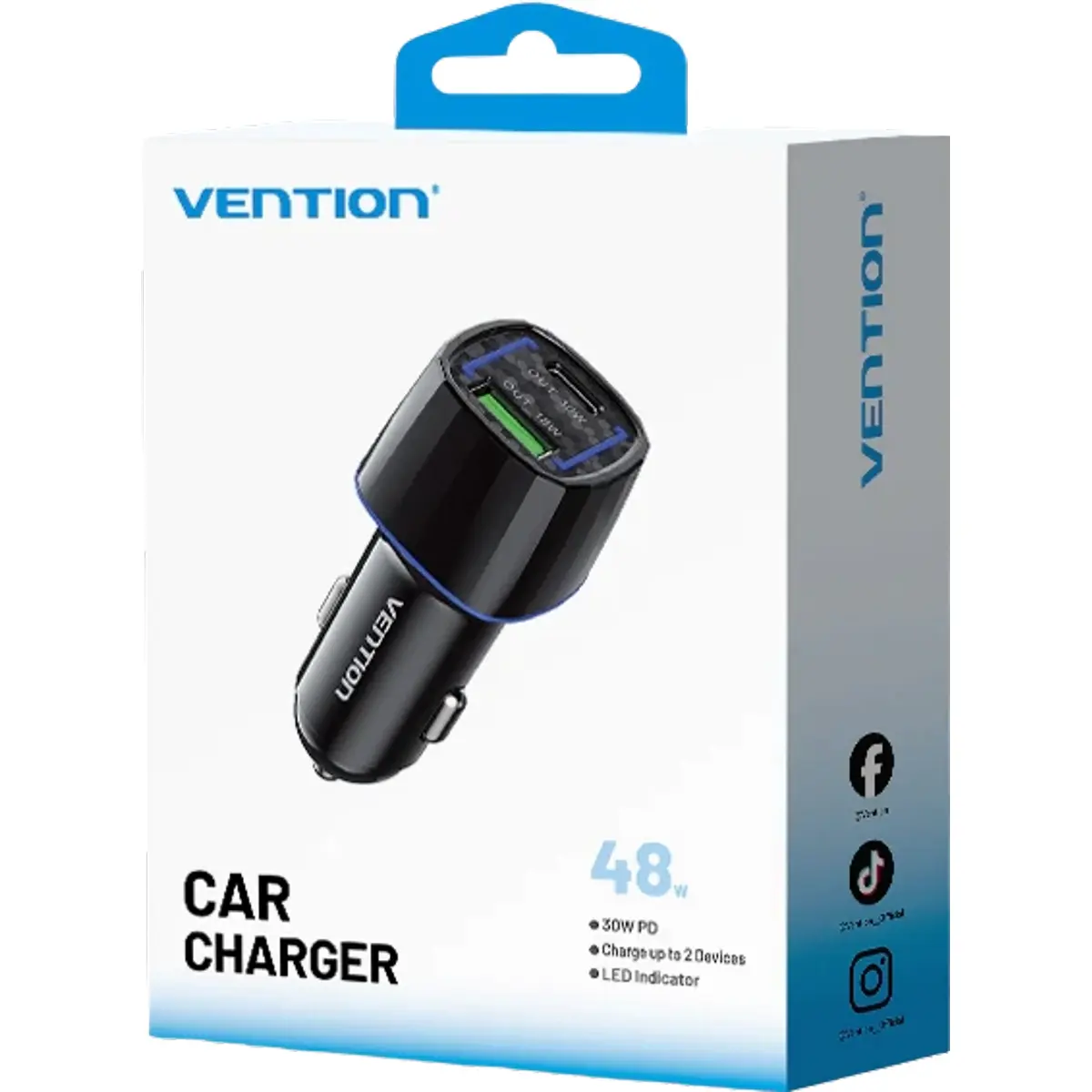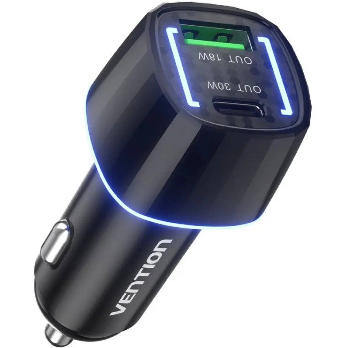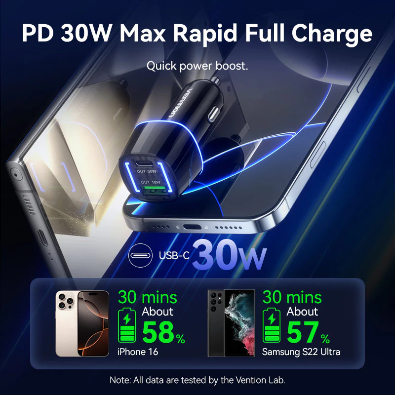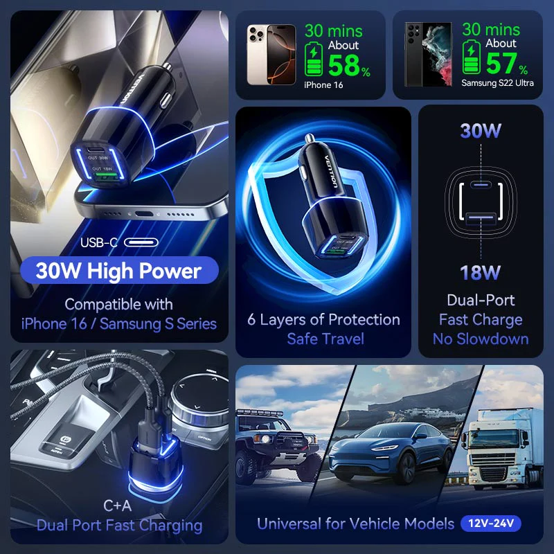 Carregador de isqueiro automóvel, robusto e de alto desempenho, ideal para quem pretende recarregar dispositivos em viagem com velocidade e segurança. Com saída PD de 30 W via USB-C e porta adicional USB-A compatível com QC 3.0, permite carregar dois dispositivos simultaneamente como, por exemplo, smartphone e tablet ou smartphone e powerbank. A potência máxima combinada das duas portas é de 48W. A segurança foi um dos alvos neste dispositivo que incorpora diversas proteções: sobrecorrente, sobretensão, curto-circuito, controlo térmico, picos de tensão e materiais resistentes ao fogo. Desta forma, o carregador de isqueiro Vention protege, tanto o equipamento, como a viatura. É compatível com veículos de 12 V e 24 V (automóveis e camiões), apresenta um LED azul de luz suave que informa acerca do seu funcionamento e os encaixes reforçados garantem que não se solta em pisos irregulares. Com este carregador de isqueiro pode, durante a viagem, carregar rapidamente smartphones, tablets, GPS, powerbanks, auscultadores Bluetooth, entre outros dispositivos móveis. Com compatibilidade universal, suporta dispositivos Android, iPhone, iPad, Samsung Galaxy, Xiaomi, Huawei, Google Pixel, Nintendo Switch, entre outros.
