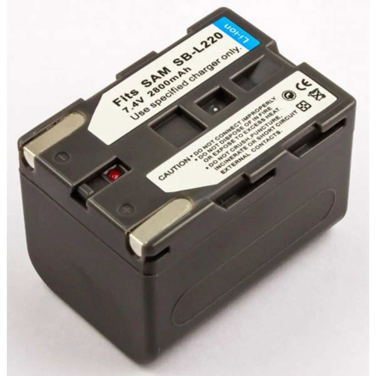 Bateria de substituição compatível com câmara Samsung SB-L220, com 7.4V, 2800mAh e 20.7Wh em Li-Ion. Dimensões de 55,4 x 38,2 x 39,3 mm e peso de 140 g, fornecendo energia estável para a câmara.