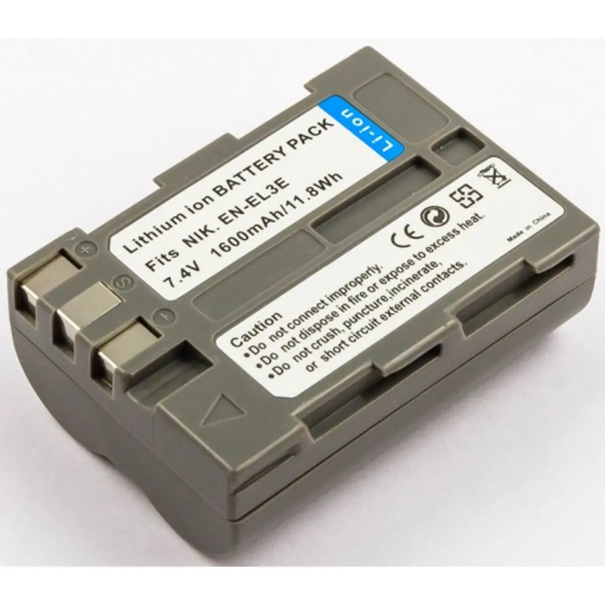 Bateria de reposição compatível com Nikon EN-EL3e para câmaras, com 7,4V, 1600mAh e 11,8Wh de Li-Ion. Possui dimensões compactas de 55,9 x 39,5 x 21,2 mm e peso de 80 g, adequada para utilizadores que necessitam de uma fonte de energia estável e fiável para o modelo EN-EL3e.
