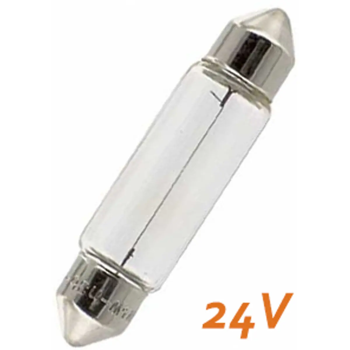Lâmpada festoon de 24V com 10W de potência, base SV8.5-8 e fluxo luminoso de 105 lúmenes. Possui tolerâncias de ±10% na potência e de ±20% no fluxo, e dimensões compactas de 41 mm de comprimento por Ø11 mm de diâmetro. Compatível com iluminação de baixa tensão em interiores ou dispositivos que exijam componentes pequenos, com tensão de teste de 28V e desempenho estável e fiável.