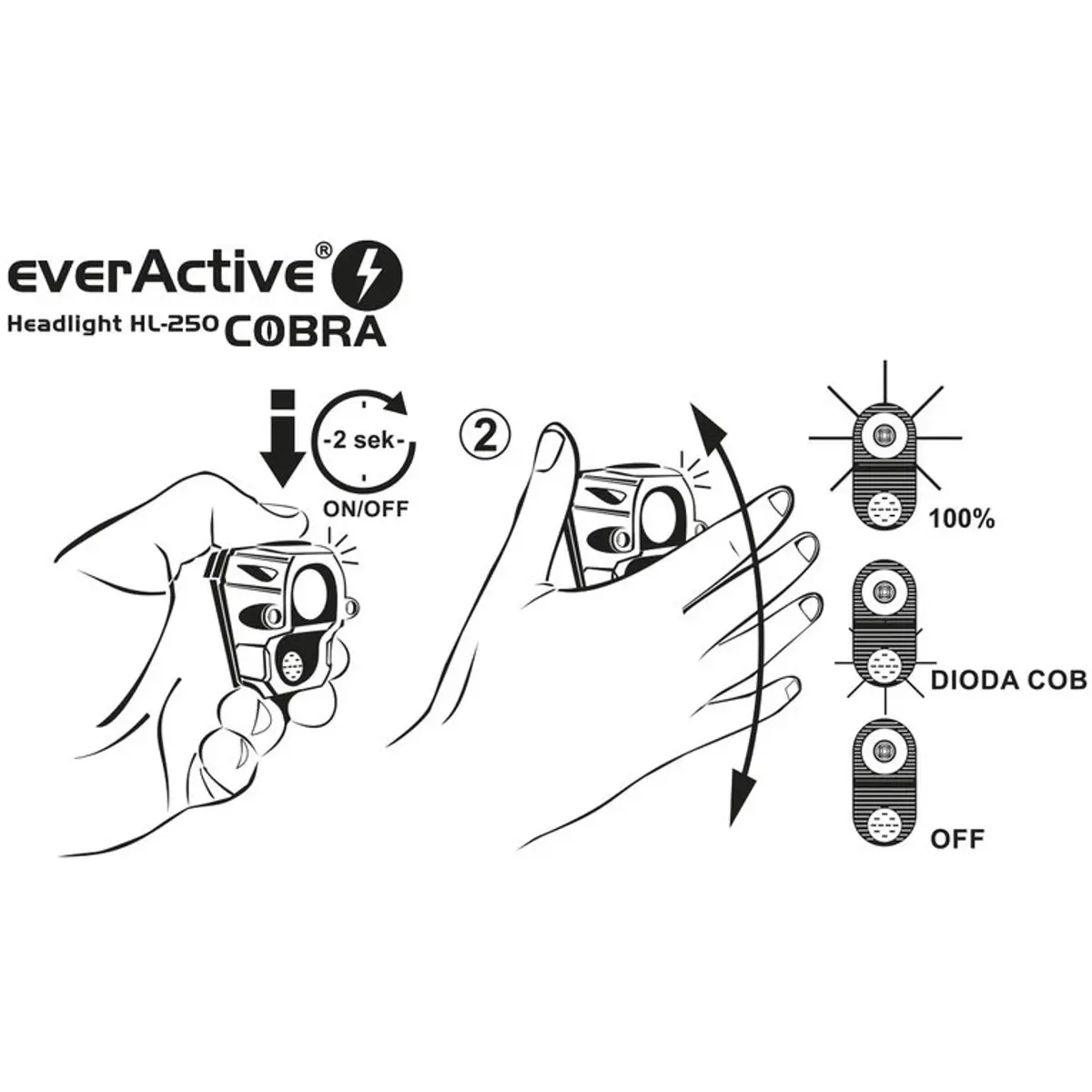 A lanterna everActive Cobra HL-250 é extremamente fácil de usar - com uma carcaça pequena, muito leve e sólida, esconde uma moderna fonte de luz com dois LEDs - CREE XP-E2 e COB 3W.