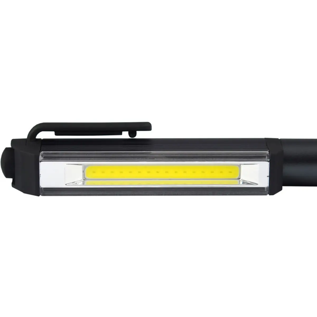 Lanterna LED COB de 3W, fabricada em alumínio, oferece 200 lúmenes de iluminação estável com cabeça móvel que gira em 180°. O corpo compacto é à prova d'água e possui ímanes na base para fixação adicional. Alimenta-se com 3 pilhas AAA, com peso de 55 g sem baterias (95 g com baterias) e dimensões de 162 x 14 x 29 mm. Funciona em modo único de 100% e tem alcance de iluminação de cerca de 7 metros. Ideal para trabalhos de oficina, reparos e emergências.