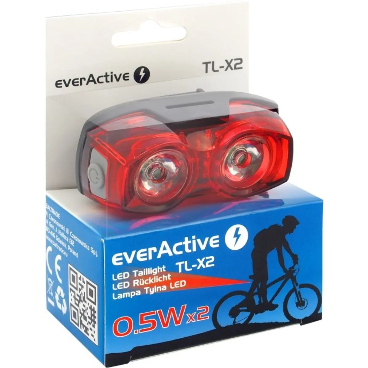 TL-X2 é uma luz traseira de bicicleta de alta qualidade com luz LED muito brilhante. Equipado com dois LEDs vermelhos de 0, 5W, o TL X2 gera a luz visível em todas as condições climáticas ainda mais difíceis: neblina densa, luz solar forte, chuva forte ou queda de neve abundante. Em boas condições, a luz é visível a uma distância de 500m. O design da lâmpada garante não apenas que seremos vistos de longe na parte traseira, mas também oferece excelente visibilidade pelas laterais, mesmo acima de 180 °.