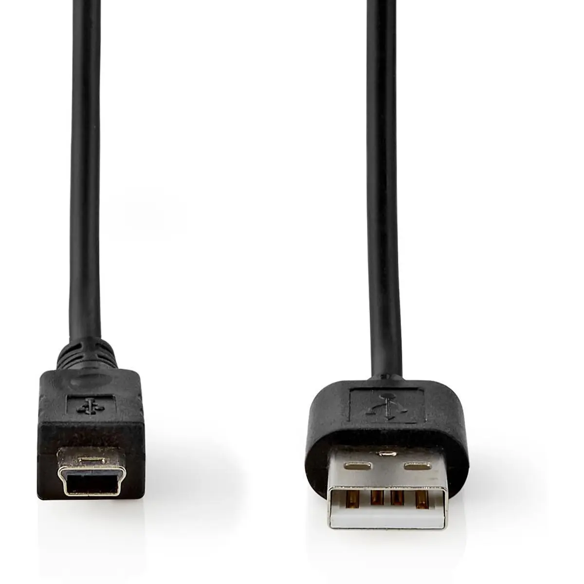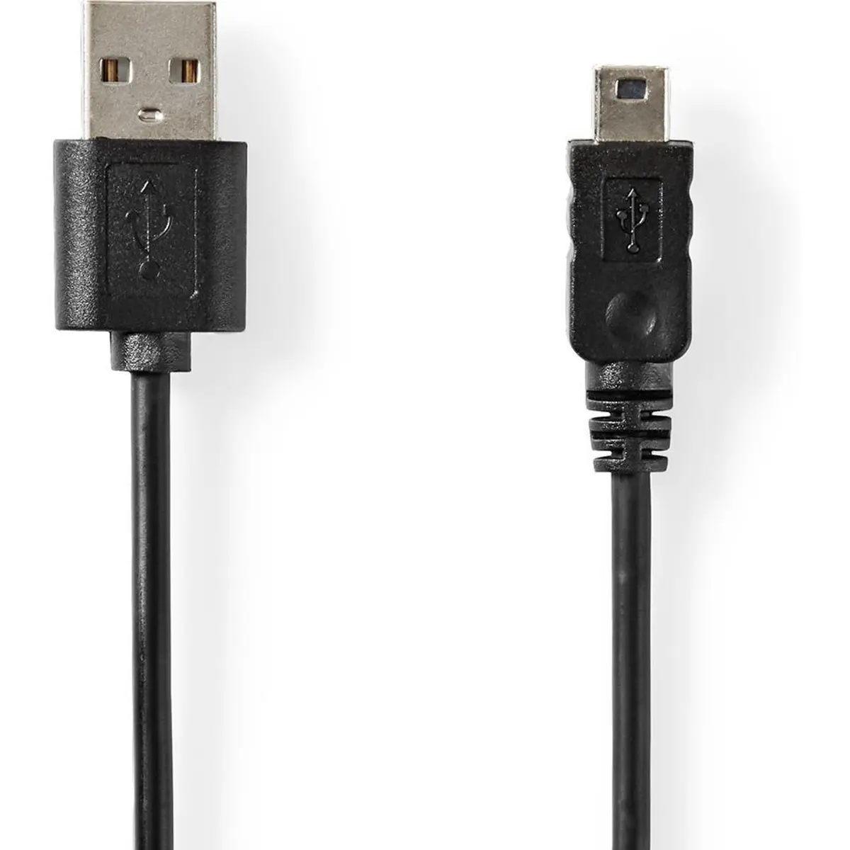 Este cabo USB 2.0 liga USB-A Macho a USB Mini-B 5 pinos Macho, cabo redondo com condutor de cobre (AWG 30). Oferece taxa de transferência de até 480 Mbps, corrente de saída de 1.1 A e potência de 5.5 W, com comprimento de 2.0 m e cor preta. Ideal para ligações entre dispositivos com estas interfaces.